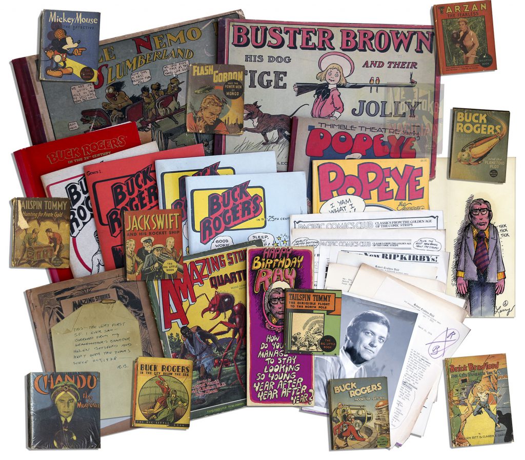 Ray Bradbury’s own comic books and an autograph note signed by Bradbury pertaining to one: ”This – the first S.F. I ever saw – borrowed from my grandmother’s boarder Helen Botsford and kept over the years since Oct. 1928 – / R.B.” Lot of 23 comic books comprises 11 full size or larger books and 12 mini books. Full size comics include: (1-2) ”Amazing Stories Quarterly” from fall of 1928 with Bradbury’s note. Book is missing its cover and is accompanied by an identical edition that still has its cover; (3) limited edition ”Buck Rogers in the 25th Century” book titled, ”Great Classic Newspaper Comic Strips, No. 1”, number 111 of 500, with strips 1-98; (4) limited edition ”Buck Rogers” book, ”Great Classic Newspaper Comic Strips, No. 2”, number 138 of 500, with strips 99-198; (5-6) two limited edition ”Buck Rogers” books, ”Great Classic Newspaper Comic Strips, No. 7” from 1967 featuring reprints of the 1929 daily strips 199 to 310; (7) ”Popeye: The First Fifty Years” from 1979; (8) ”Thimble Theatre Starring Popeye” from 1932; (9) ”Buck Rogers in the 25th Century” from 1975; (10) ”Buster Brown, His Dog Tige And Their Jolly Times”, copyright 1905 by R.F. Outcault. Measures 16” x 11”; (11) ”Little Nemo in Slumberland”, copyright 1909. Measures 16.75” x 11.25”. Lot also includes a dozen mini comic books with copyright dates ranging from 1934 to 1943: (12) ”Flash Gordon and the Power Men of Mongo”; (13) ”Jack Swift and His Rocket Ship”; (14) ”Mickey Mouse the Detective” featuring Goofy in his earlier incarnation as Dippy Dawg; (15) ”Tailspin Tommy”; (16) ”Buck Rogers on the Moons of Saturn”; (17) ”Buck Rogers in the City Below The Sea”; (18) ”Tailspin Tommy Hunting for Pirate Gold”; (19) ”Mandrake the Magician”; (20) ”Tarzan the Fearless”; (21) ”Buck Rogers and the Planetoid Plot”; (22) ”Brick Bradford in the City Beneath the Sea”; (23) ”Chandu the Magician”. Each measures approximately 3.75” x 4.5” x 1.5”. Toning, wear to exteriors, some loose pages, Bradbury’s name stamp to first few papers on some and the Mickey Mouse book has been colored in with crayon. Books range from good to very good condition. With a COA from the Ray Bradbury estate. Sold for $2,888.