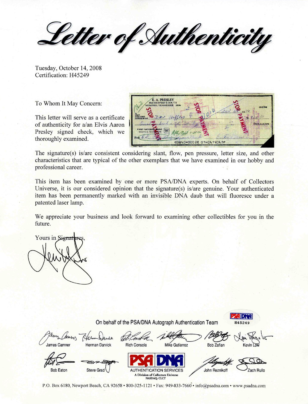 Sell Your Elvis Presley Check Signed