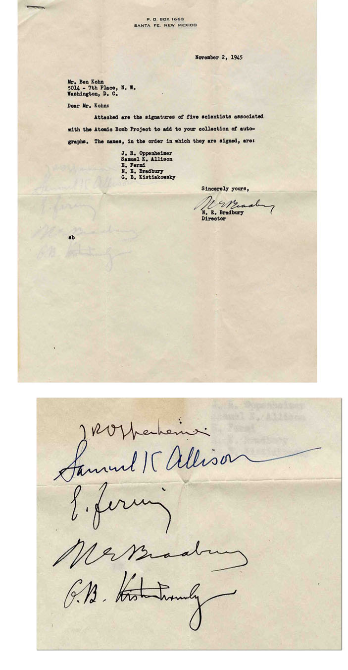 Typed letter signed by Manhattan Project Director Norris Bradbury, who encloses the signatures of the “five scientists associated with the Atomic Bomb Project.” On a separate sheet are the promised signatures, written boldly by all: “J.R. Oppenheimer”, “Samuel K. Allison”, “E. Fermi”, “N.E. Bradbury” and “G.B. Kistiakowsky”. Letter dated 2 November 1945 is on official “P.O. Box 1663 / Santa Fe, New Mexico” stationery, the secret P.O. Box address used for the project whose physical location was undisclosed. Also includes original mailing envelope postmarked 7 November 1945. Document, measuring 8.5″ x 11″ has some folding from mailing, else near fine. Sold for $3,800.