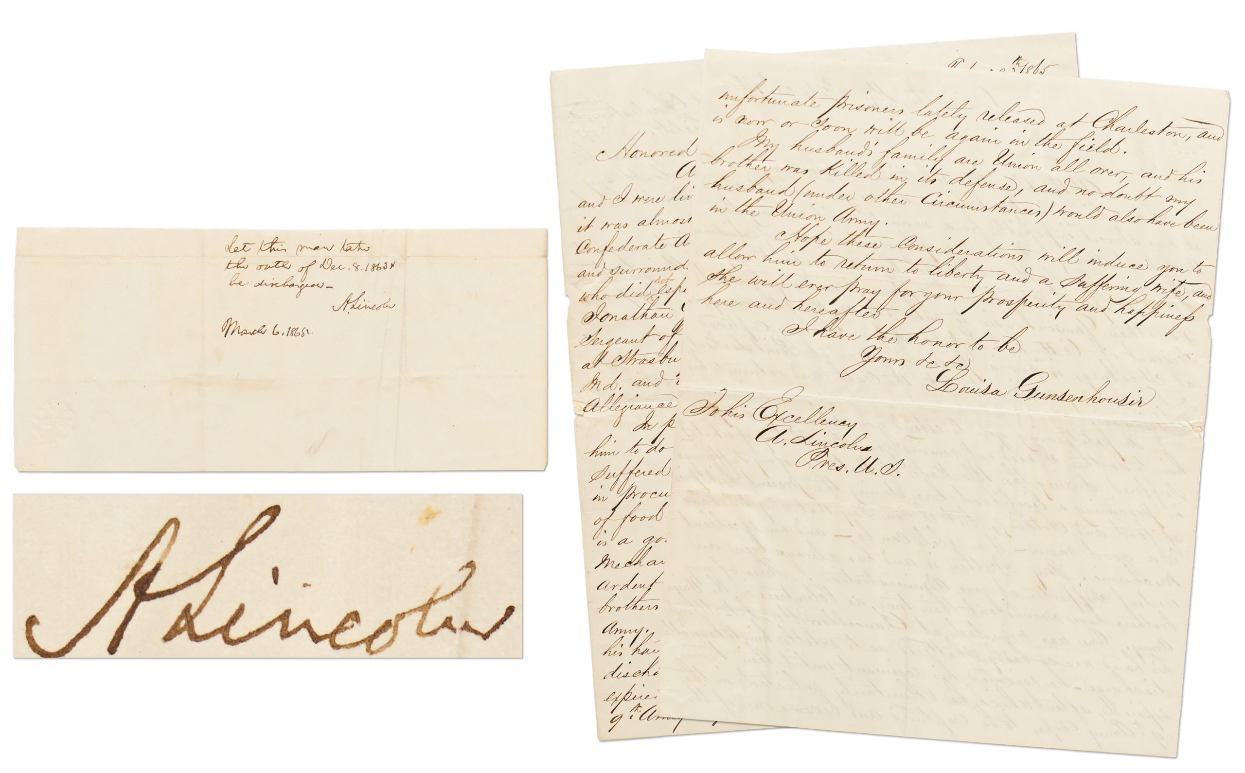 Endorsement is accompanied by an interesting letter from the wife of the Confederate soldier who received the endorsement. Dated 28 February 1865, letter to Lincoln reads in part, ”At the time this rebellion broke out my husband and I were living in New Orleans, and as you are well aware it was almost impossible for a man to avoid entering the Confederate Army…those who made life miserable to anyone who did not espouse secession, I suppose caused my husband Jonathan Gunsenhousir to enter the ranks of the enemy, as Sergeant of Co. H 14th Regt. La. Inf…my husband i s a good man – if a rebel can be…” Letter measures 7.75” x 9.875”.