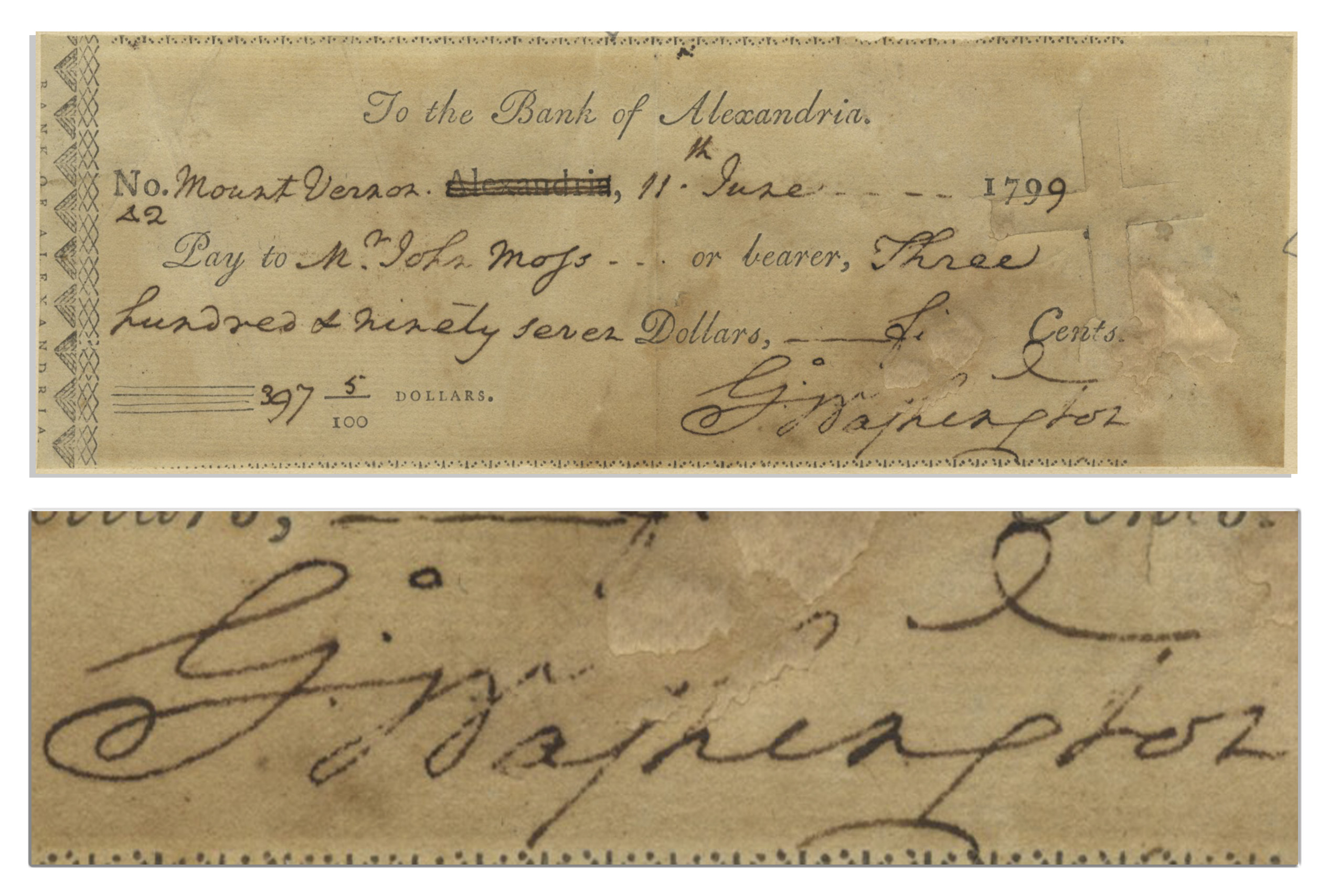 George Washington signed check, partially printed from “To the Bank of Alexandria” and filled out entirely in Washington’s hand just a few months before his death, dated 11 June 1799. Washington crossed out the pre-printed city of Alexandria and wrote “Mount Vernon”. The check is payable to a Mr. John Moss for $397.50. John Moss is probably the John Moss who before the Revolution had an ordinary at Sugar Land Run about halfway between Leesburg and Alexandria. The check is joined to a paper background that gives the check larger margins. Total size of the check is 7″ x 2 3/8″ and the total size with the paper margins is 8 7/8″ x 3 1/2″. There is some minor loss of handwriting, apparently due to prior adhesion, where Washington writes out “fifty” cents and less drastically in the top loop of the “h” in “Washington”. Excellent. Accompanied by PSA/DNA COA. Sold for $43,750.