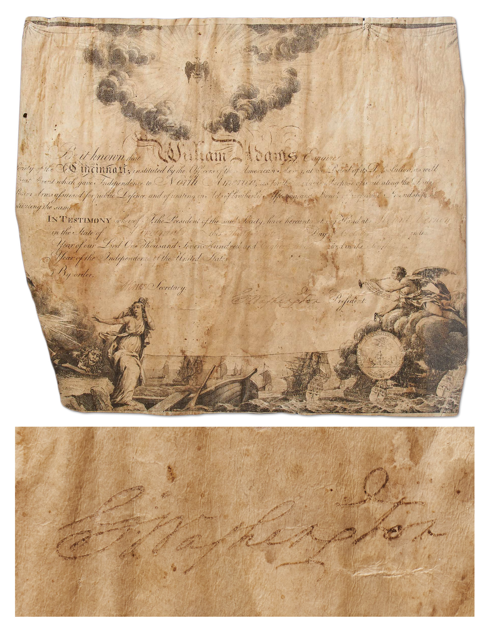 George Washington was the first president and founding member of the exclusive Society of Cincinnati, which has only been available to Revolutionary War officers and their eldest male heirs. We sold a Washington signed document that granted membership to William Adams for $10,625. Document is dated 31 October 1785 and signed ”Go: Washington” as President of the organization.
