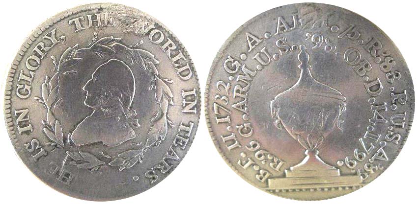 We sold a George Washington silver funeral medal designed by Jacob Perkins of Newburyport, MA. These medallions had holes at the top to to allow wear in funeral processions, however the hole of this medallion has been filled. Coin features Washington’s profile and the text, “He is in glory. The world in tears.” Only 25-40 of these silver medals exist today.