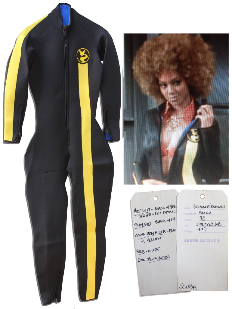 Beyonce wetsuit from her role in ”Austin Powers in Goldmember”. The pop singer stars in the Mike Myers comedy as Foxxy Cleopatra. Custom black neoprene wetsuit with yellow striping has no label and features a little fox icon in yellow print on the left breast. Measures 12.5” across the chest with a 28” inseam and 19.5” sleeve. In near fine condition. With partially printed wardrobe department tag rubber stamped, ”Austin Powers 3” and citing, ”Actor Beyonce Knowles / Character Foxxy / Scene 93 / Set Int. Dr. Evil’s Sub / Change #9 / Scuba”. Sold for $15,625.