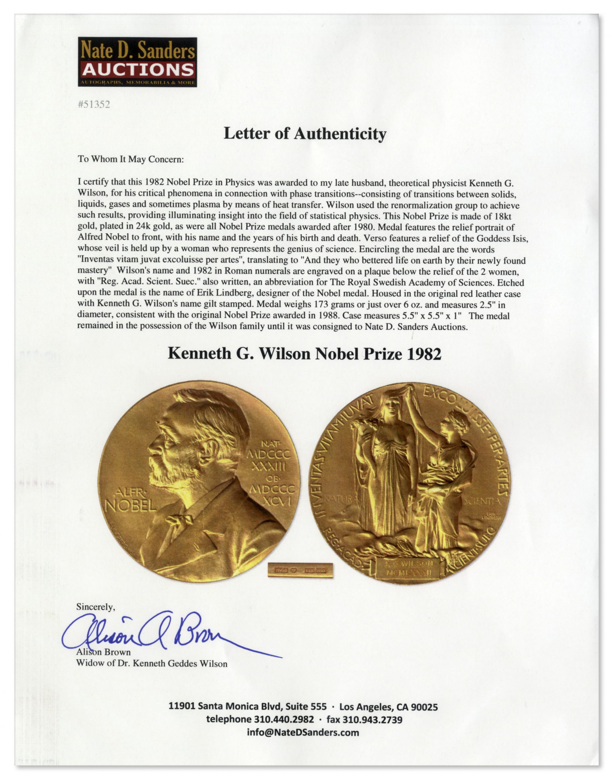 The 1982 Nobel Prize in Physics, awarded to theoretical physicist Kenneth G. Wilson for his work in understanding the ”critical point” of phase transitions – the exact point at which matter transitions to another state, such as when a solid become liquid. Wilson’s work was subsequently applied to quantum mechanics, where he is considered a pioneer who laid the theoretical groundwork for today’s quantum physicists. Nobel Prize is made of 18kt gold, plated in 24kt gold, consistent with the 1982 medals. Medal features the relief portrait of Alfred Nobel to front, with his name and the years of his birth and death. Verso features a relief of the Goddess Isis, whose veil is held up by a woman who represents the genius of science. Encircling the medal are the words ”Inventas vitam juvat excoluisse per artes”, translating to ”And they who bettered life on earth by their newly found mastery”. Wilson’s name and 1982 in Roman numerals are engraved on a plaque below the relief of the 2 women, with ”Reg. Acad. Scient. Suec.” also written, an abbreviation for The Royal Swedish Academy of Sciences. Etched upon the medal is the name of Erik Lindberg, designer of the Nobel medal. Housed in the original red leather case with Kenneth G. Wilson’s name gilt stamped. Medal weighs 173 grams or just over 6 oz. and measures 2.5” in diameter. Case measures 5.5” x 5.5” x 1”. Presented in near fine condition. With an LOA from Kenneth Wilson’s widow. Sold for $118,750.