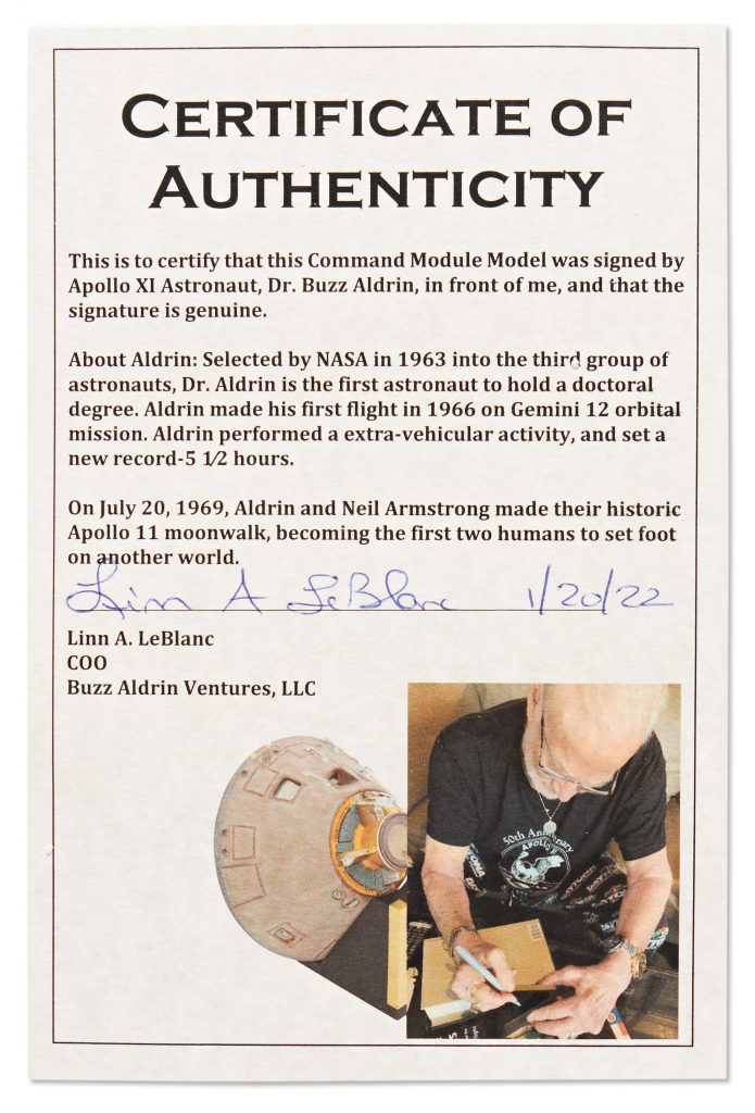 Buzz Aldrin signed Apollo 11 Command Module model. Highly detailed 1:25 scale model rests upon a base signed by Aldrin in silver ink. Gold base commemorates the 50th anniversary of the Apollo 11 moon landing. Injection molded model gives an interior view of the module, showing the sleeping chamber for the three astronauts. Entire model measures 6” x 6” x 6” high. Minor discoloration to base of module, else near fine condition. Accompanied by Aldrin’s COA. Sold for $1,000.