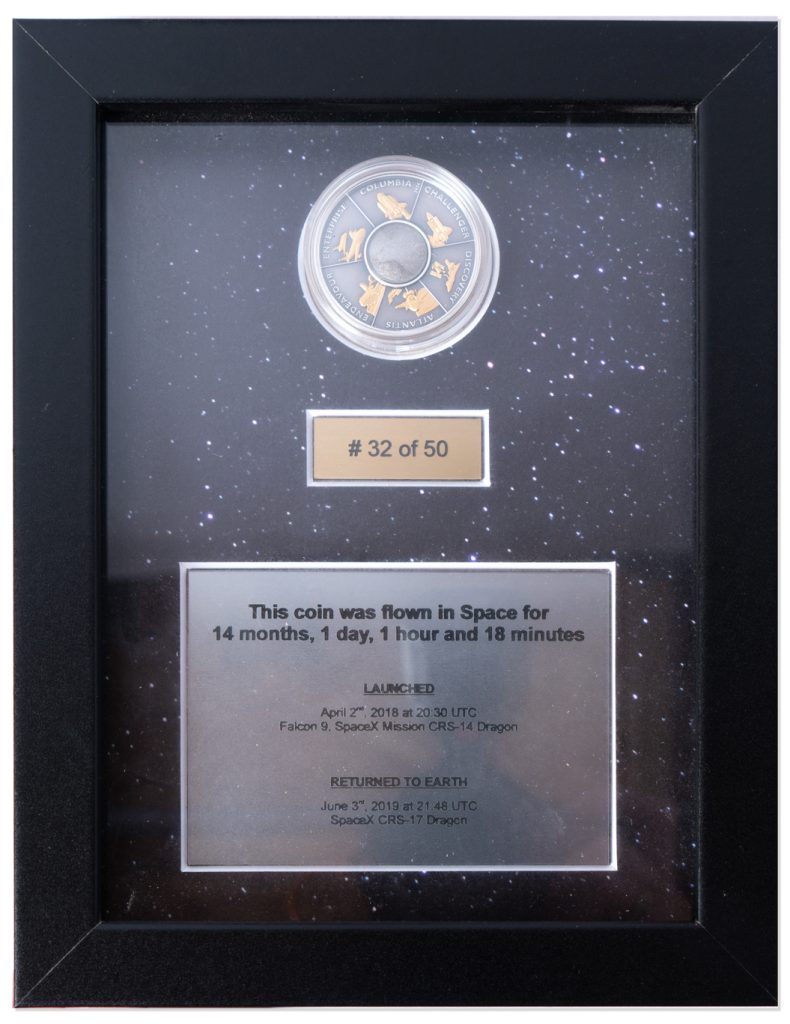SpaceX flown silver coin, part of the next generation space venture launched by Elon Musk. Coin was flown in space for over one year, flown to the International Space Station on SpaceX Mission CRS-14, and then retrieved 14 months later on SpaceX Mission CRS-17. Coin is #32 in a low limited edition of 50, featuring images of all five Shuttle Orbiters. Minted with .999 silver. Coin measures 1.5” in diameter, framed to 6.875” x 8.75”. Near fine condition. With accompanying booklet from Alpha Space describing the process of minting and flying the coins. Sold for $5,068.