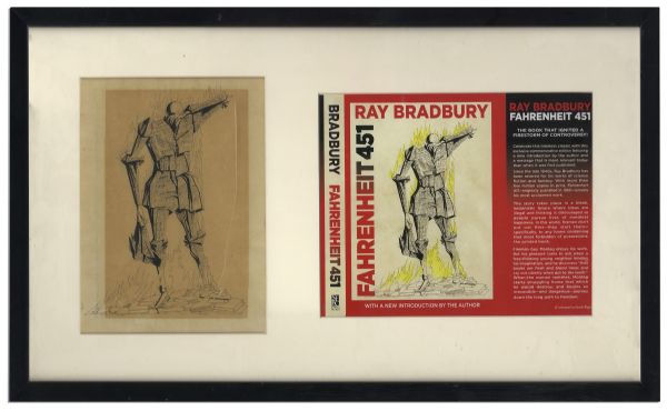One of the pieces up for bid is a preliminary cover art painting by Joseph Mugnaini for Fahrenheit 451. The watercolor and sketch shows figures that readers will recognize that ended up as the final artwork for the first edition of that book.