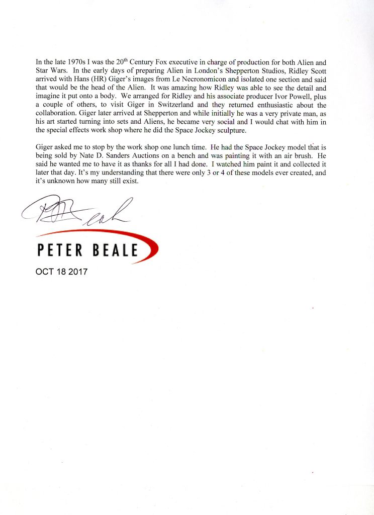 The model is reportedly one of only three or four known to exist and comes from the collection of Peter Beale, former 20th Century Fox executive who was given the model by Giger and whose LOA accompanies the piece. The original mold was intentionally cut into smaller parts to be used by the technicians who constructed the set, so the remaining models are the only extant original sculptures of the scene. This model measures 43” wide x 36” long x 16.25” high, hand painted in tones of grey, brown and black by Giger. Space Jockey is fused into his pilot seat, which swivels around on a circular platform. The swiveling piece can be removed and measures 13.5” long x 10.25” high x 4.5” wide. Entire model weighs over 47 lbs., glued to a painted sheet of plywood. A few chips to the resin, otherwise in near fine condition. One of the finest ”Alien” props ever to be sold at auction. Sold for $31,250.