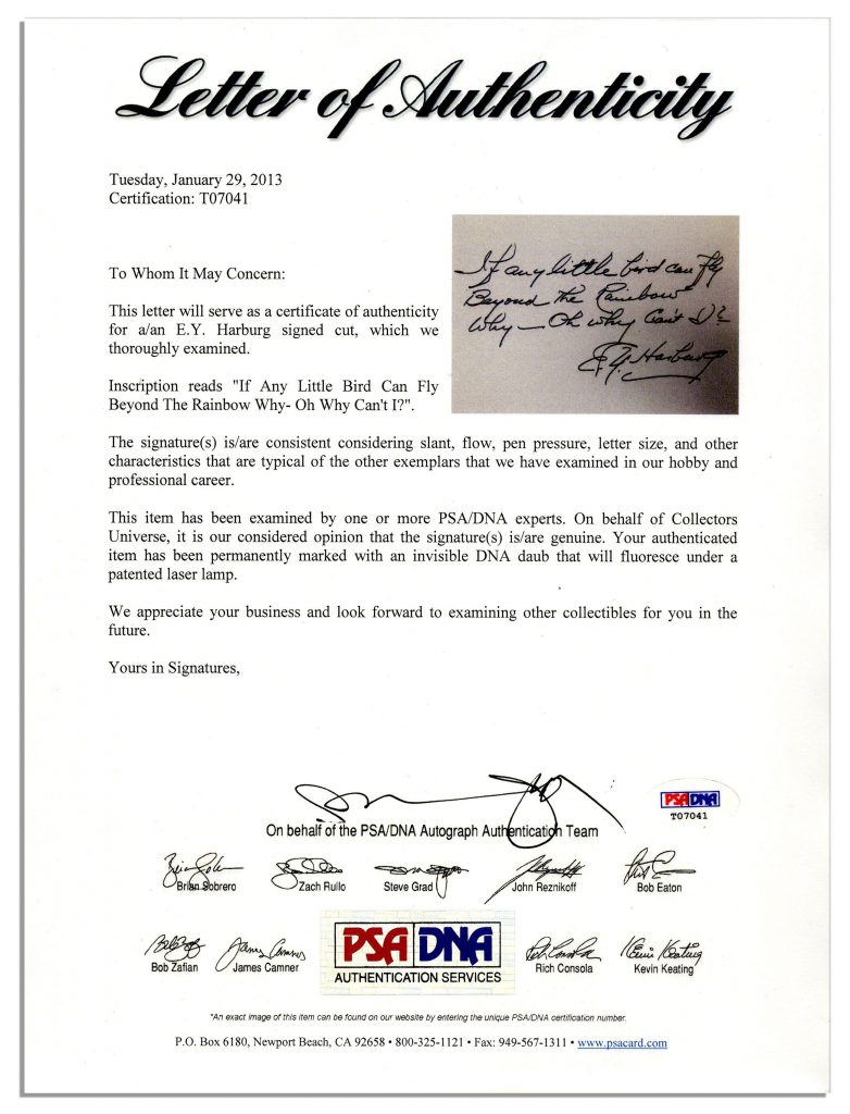 ”Somewhere Over the Rainbow” lyrics handwritten and signed by the lyricist E.Y. Harburg, who wrote them for Judy Garland in ”The Wizard of Oz.” Harburg, in fact, wrote lyrics for all of the songs in the revered 1939 MGM film, and won an Oscar for his work on the music of the film that year. Lyrics from the last stanza of the song are written in Harburg’s hand in black ink and read: ”If any little bird can fly / Beyond the rainbow / Why — Oh why can’t I? / E.Y. Harburg”. Card measures 8.5” x 5” and is elegantly matted and framed to an overall size of 13” x 9.25”. Fine condition. With a COA from PSA/DNA.