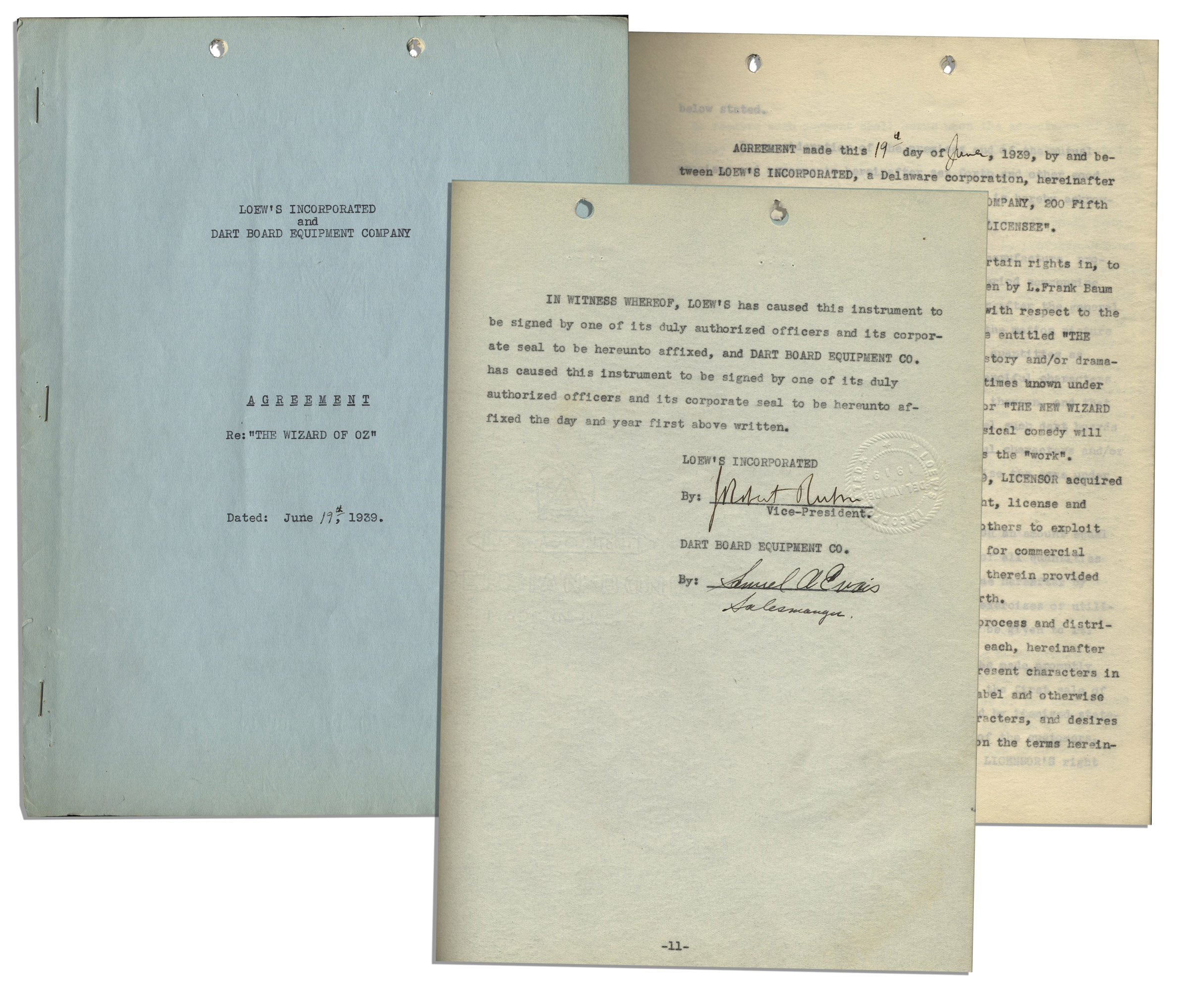 ”Wizard of Oz” licensing agreement. Dated 19 June 1939, contract between Loew’s Inc. and Dart Board Equipment Co. is drawn for the licensing and merchandising of dart boards based on the film. Signed on the last page by representatives of Loew’s Incorporated and the Dart company’s sales manager. Runs 11pp., bound with staples to the left margin. Measures 8.5” x 11.25”. Near fine, with expected creasing to binding, punch holes to top edge, and several ink corrections and initials. Sold for $938.
