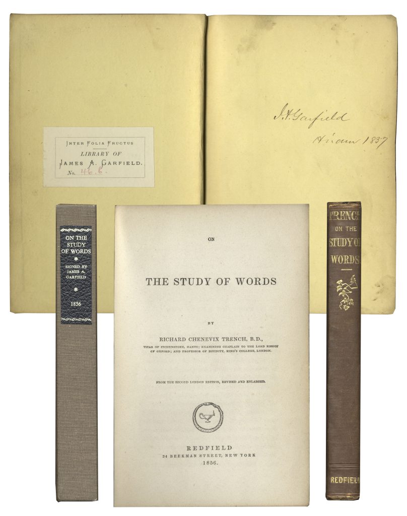 James Garfield signed book and from his personal library, very rare as such. Garfield signs ”J.A. Garfield / Hiram 1857” upon the front free endpaper of ”On the Study of Words” by Richard Trench and published by Refield: New York: 1856. At the time Garfield signed the book, he had returned to Hiram, Ohio as President of Hiram College where he first worked as a janitor 6 years prior. Upon the front pastedown, Garfield’s private library label is present, reading ”Inter Folia Fructus [Among the Leaves, Fruit] / Library of / James A. Garfield / No. 46.b.” Measures 5.25” x 7.5”. Book is in very good plus, well-preserved condition, with just a hint of wear to the boards and interior toning. Housed in a custom-made slipcase. Sold for $1,204.