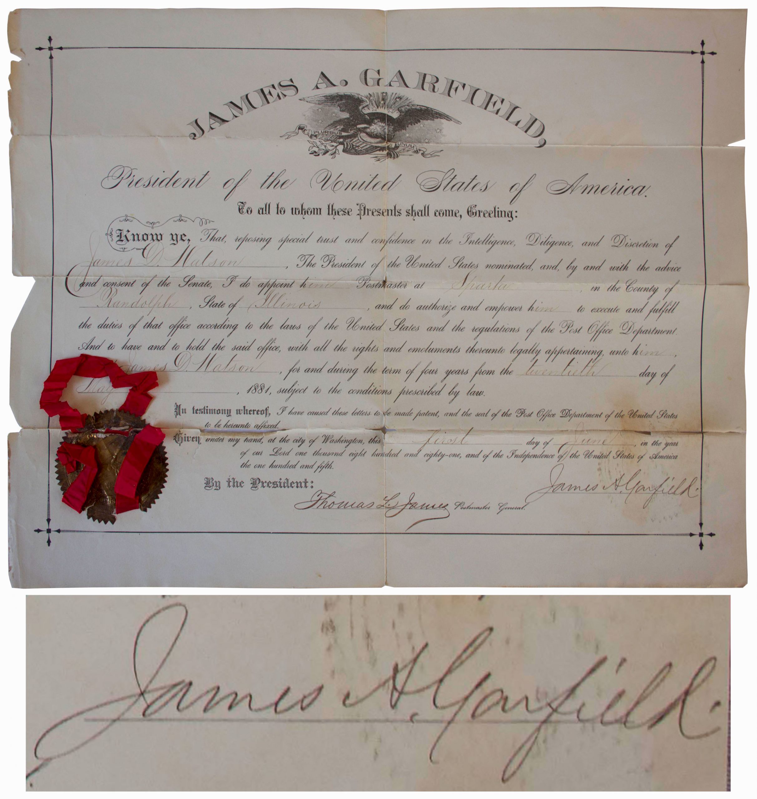 James Garfield document signed as President, appointing James Matson as Postmaster in Sparta, Illinois. Elegantly signed at lower right, “James A. Garfield” on 1 June 1881. Garfield is one of the rarest Presidential signatures as he was only in office six months before an assassin’s bullet took his life. Document measures 17″ x 14″ with striking bronze seal with red ribbon attached. Separation starting along folds and chipping to left edge. Some shadowing of seal on signature. Overall in very good condition. Sold for $4,566.