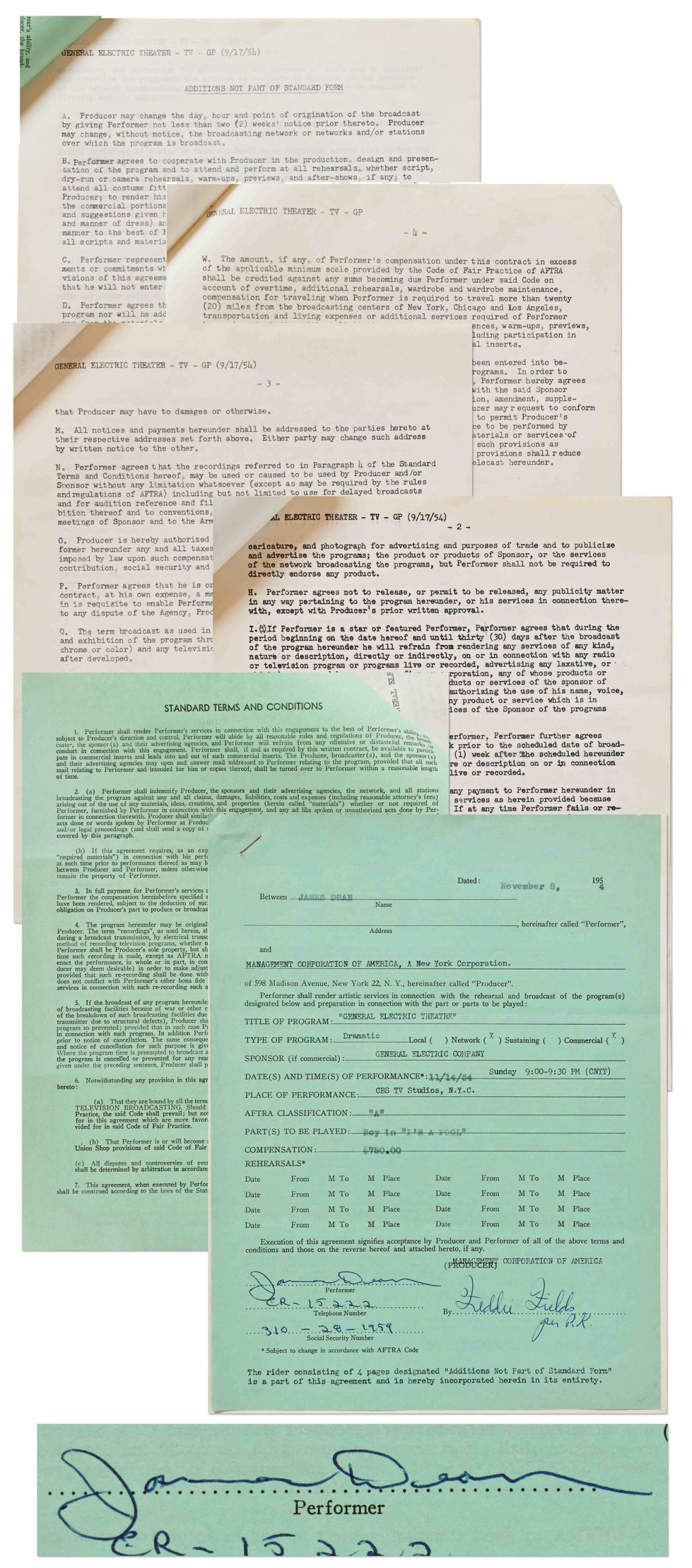 James Dean signed contract with MCA, which produced the CBS show ”G.E. Theatre”. Dean signs ”James Dean” in blue ballpoint, also handwriting his social security and telephone numbers. Dated 8 November 1954, contract is for the episode ”I’m a Fool” which aired 14 November 1954, also starring Natalie Wood. Single page contract plus four additional pages measures 8.5” x 11”, stapled at top left. Light creasing, else near fine condition. From the estate of James Dean’s agent, Jane Deacy. Sold for $3,750.