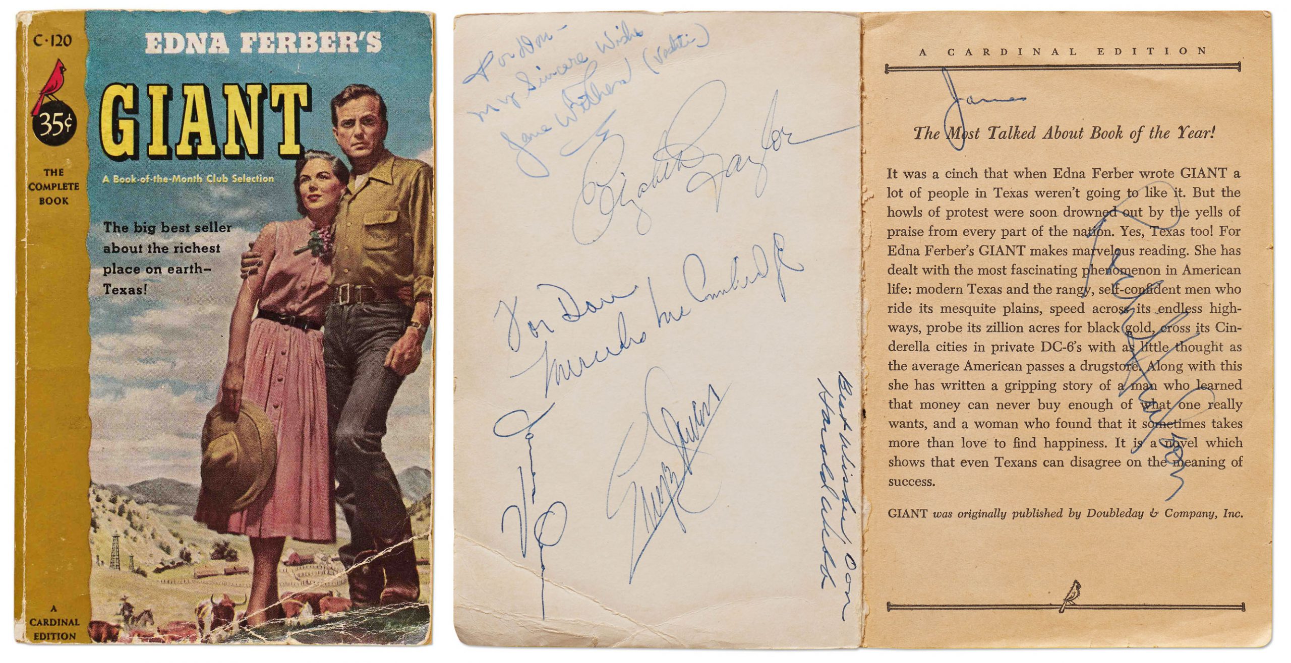 Mass market paperback is signed upon the inside of the pictorial front cover and fly-leaf by the stars of the film adaptation, ”James Dean”, ”Elizabeth Taylor”, ”Rock Hudson”, ”Jane Withers”, ”Mercedes McCambridge” and by the director ”George Stevens” and special effects designer ”Harold Webb”. Webb, Withers and McCambridge add a dedication in their hand. Sold for $5,625.
