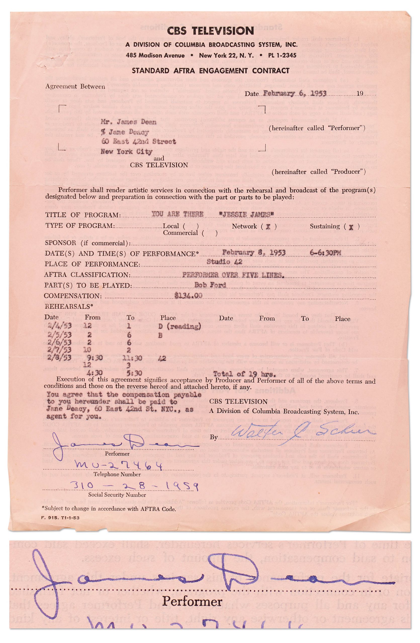 James Dean signed contract with CBS Television, dated 6 February 1953. Contract binds Dean to perform as the character Bob Ford in the episode ””The Capture of Jesse James” for ”You Are There”, which aired 8 February 1953. In addition to signing his name, ”James Dean” in blue fountain pen, Dean also handwrites his social security and telephone numbers. Single page measures 8.5” x 11”. Minor edgewear, overall in very good condition. From the estate of James Dean’s agent, Jane Deacy. Sold for $3,750.
