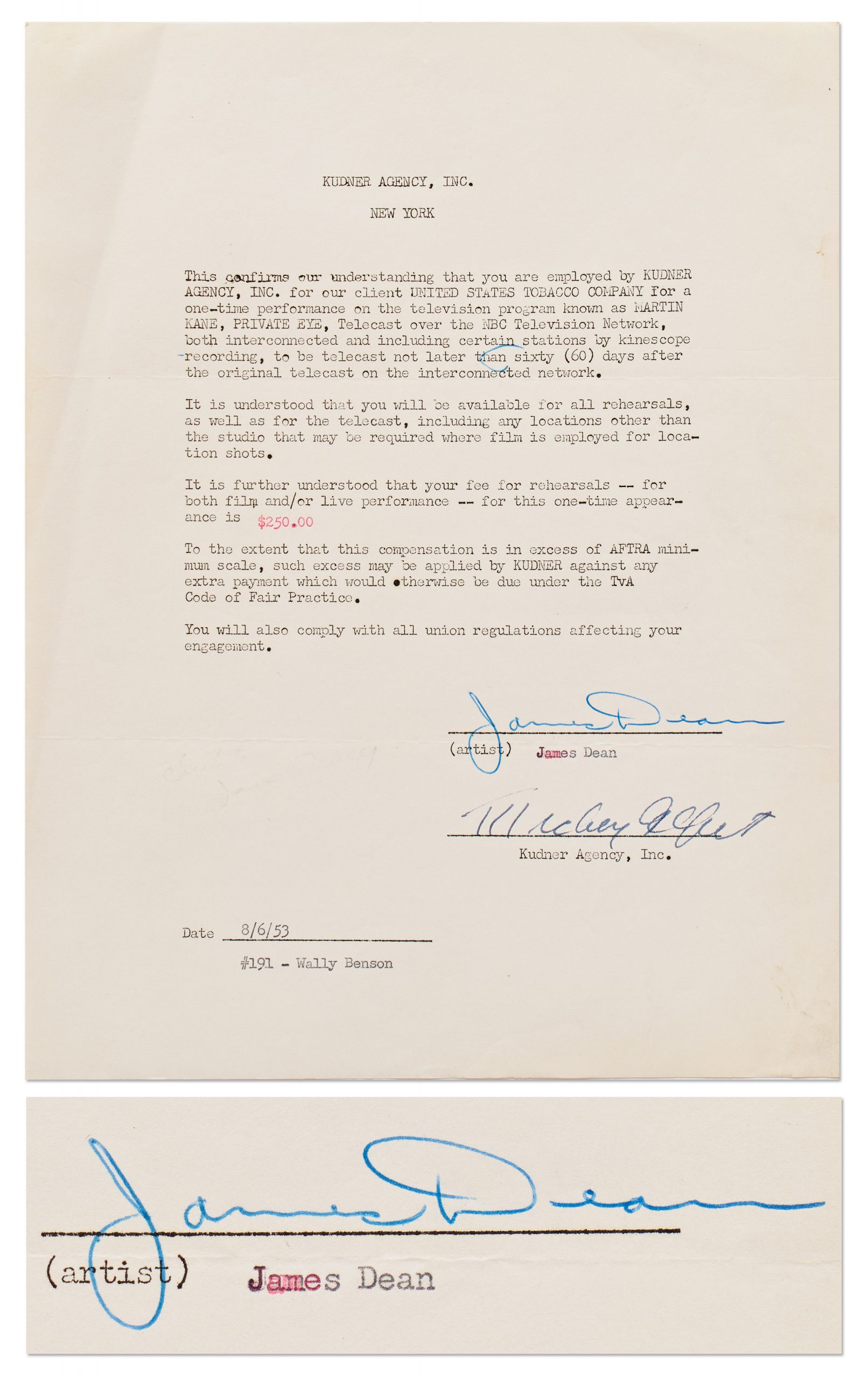 James Dean signed contract from 6 August 1953 with Kudner Agency, Inc., which produced the NBC show ”Martin Kane, Private Eye”. Dean was famously fired on this show by the director on the second day of rehearsals for supposedly not taking direction, although it didn’t slow down his TV career. Dean signs ”James Dean” in blue ballpoint. Single page contract measures 8.5” x 11”. Light creasing, overall very good plus condition. From the estate of James Dean’s agent, Jane Deacy. Sold for $3,750.