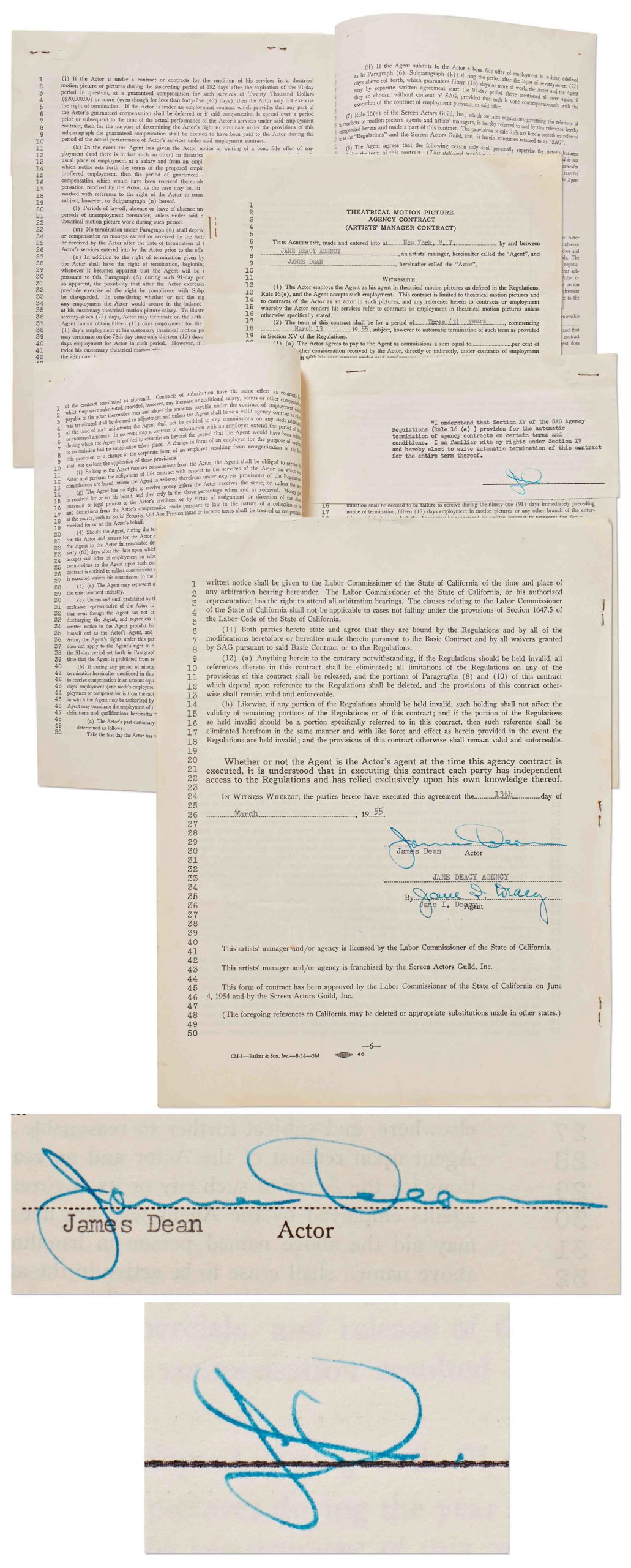 The film contract that made James Dean a Hollywood legend: Warner Bros. contract signed by Dean for ”East of Eden”, also giving Warners the option to extend Dean’s contract for several more films, which it did with ”Rebel Without a Cause” and ”Giant”. Signed by Dean (”James Dean”) on the last page, and also initialed an additional 48 times throughout by Dean.