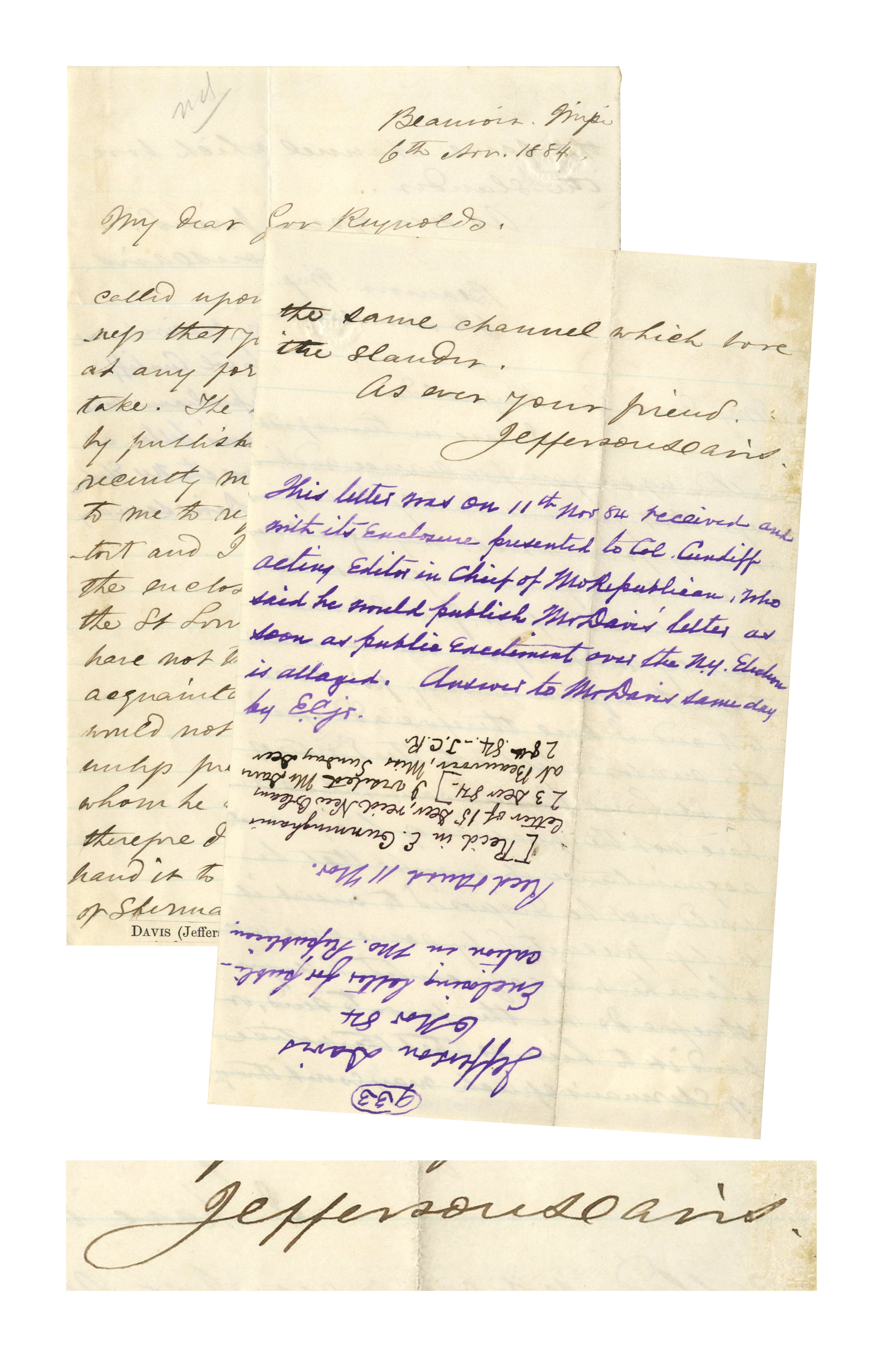Jefferson Davis Document Signed as Secretary of War in 1857. Click to enlarge.Jefferson Davis Autograph Letter Signed in Response to General William Sherman Calling Him a Conspirator — ”…Sherman’s speech…which bore the slander…”