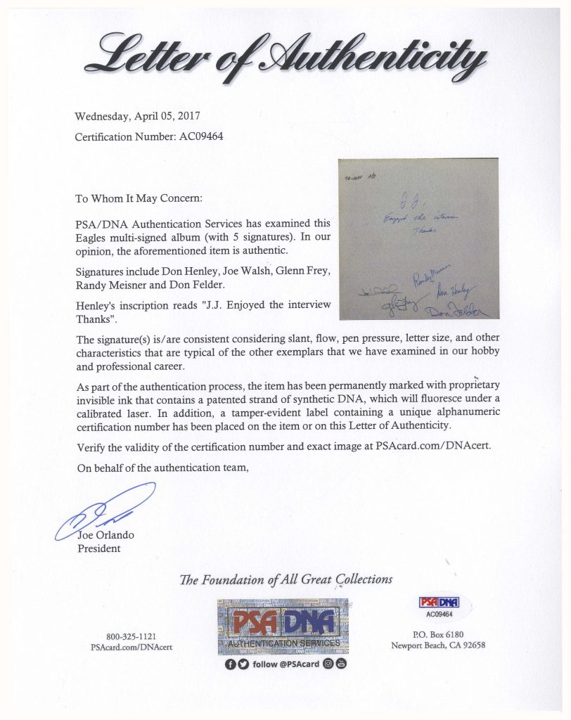 The Eagles signed test pressing of their LP ”Hotel California”. This pressing is from 1976, shortly before the album debuted in February 1977 and would go onto win a Grammy for Record of the Year, making the Eagles a household name. Pressing was given to a journalist who interviewed the band, to whom the album is inscribed, ”J.J., Enjoyed the interview / Thanks” under which they sign ”Glenn Frey”, ”Don Henley”, ”Joe Walsh”, ”Randy Meisner” and ”Don Felder”. Album cover measures 12.5” square. Minor wear and spotting to album cover, overall very good condition. Vinyl records appears near fine. With a COA from PSA/DNA. Sold for $4,063.