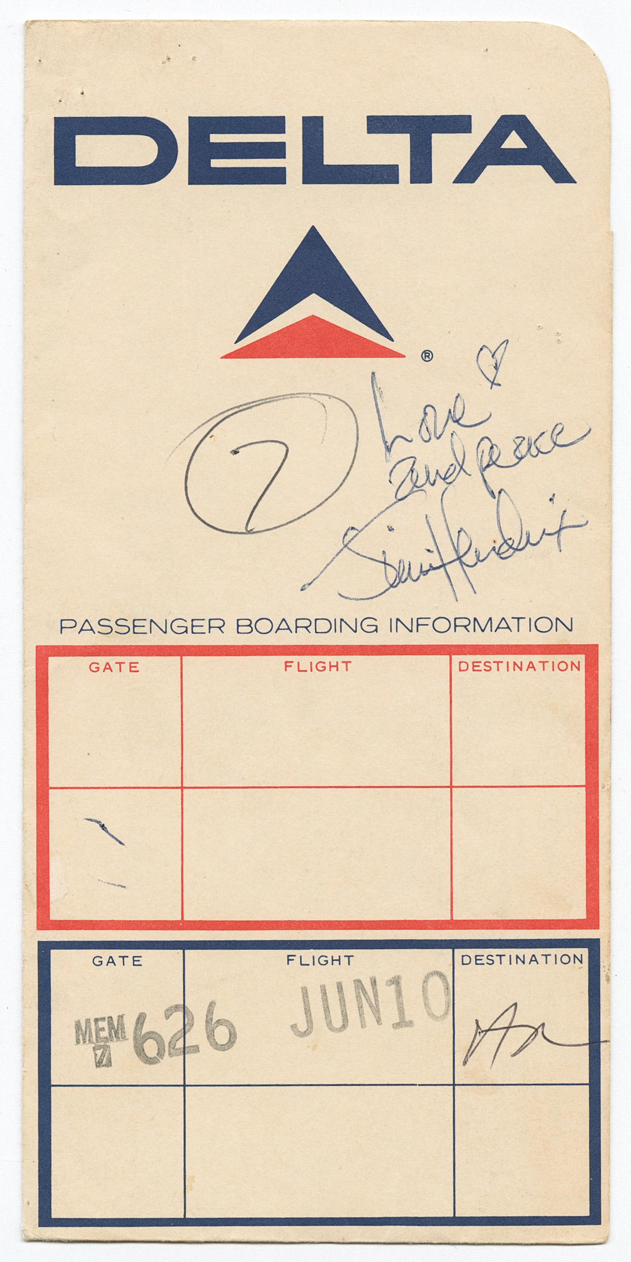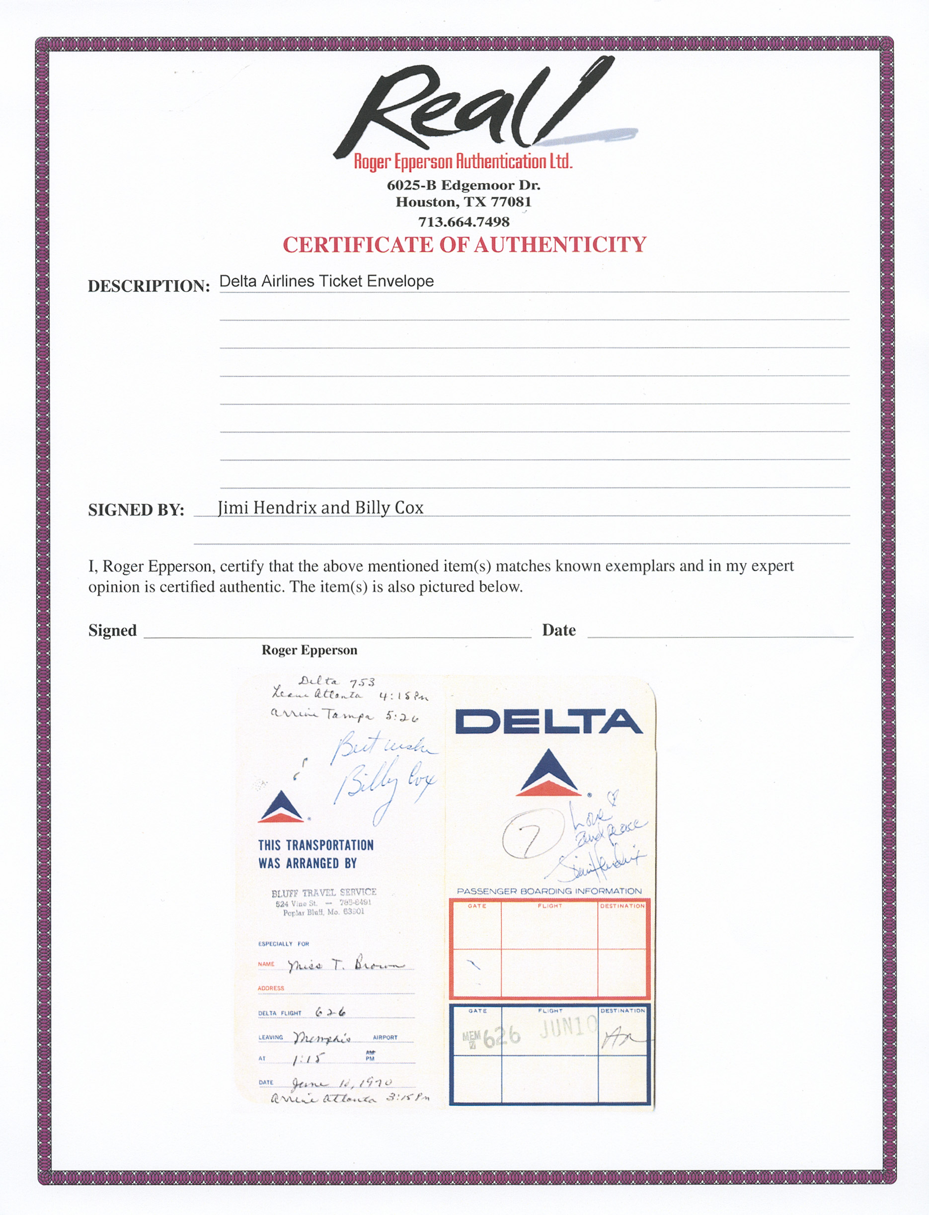 Jimi Hendrix signed boarding pass sleeve, with Hendrix signing in dark blue ballpoint, ”Love and peace [heart symbol] / Jimi Hendrix”. Signature was acquired in person by the consignor, who met Hendrix in the Memphis airport on 10 June 1970 after Hendrix asked her to have a drink at the bar. Not yet being 21, she reportedly ordered a Coke. She also obtained the signature of bassist Billy Cox, who signs the back of the sleeve. Boarding pass remains tucked into the sleeve, which measures 4” x 8”. Light uniform toning and wear, overall in very good plus condition. With a COA from Roger Epperson for both signatures. Sold for $5,824.