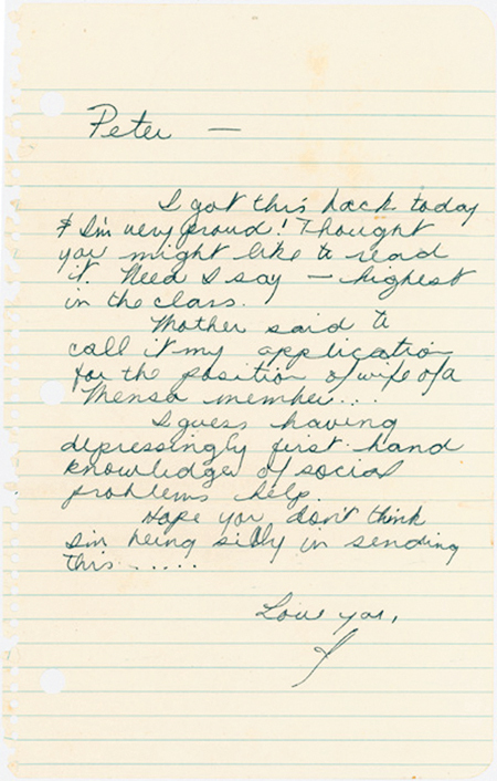 Janis Joplin autograph letter signed to her fiance Peter de Blanc in New York. Her career would launch only months after this letter, written in 1965 after she returned home to Port Arthur, Texas to get sober. It reads in part: “Peter – I got this back today & I’m very proud! Thought you might like to read it. Need I say – highest in the class. Mother said to call it my application for the position of wife of a Mensa member…I guess having depressingly first hand knowledge of social problems helps. Hope you don’t think I’m being silly in sending this……Love you, J”. 6″ x 9.25″ letter on loose leaf lined notebook paper is in very good to near fine condition. From the collection of 1965 letters of Joplin’s then fiance, Peter de Blanc. Sold for $1,177.