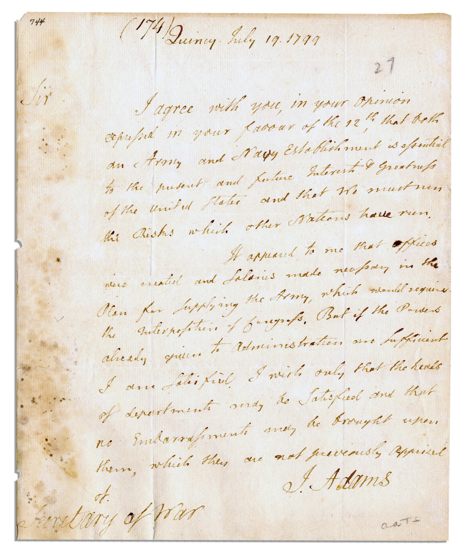 Historically important John Adams autograph letter signed dated 19 July 1799, during his term as the second American President. Adams writes from Quincy, Massachusetts to Secretary of War James McHenry regarding the need for a standing army and navy, warning of embarrassment should the department heads be surprised. After the end of the American Revolution, the U.S., distrustful of standing militaries, sold off the last ship in its Continental navy and disbanded its army. A small navy was reinstated to protect American commerce with the onset of war in Europe in 1793. The U.S. negotiated a treaty with Britain but negotiations with France broke down during the XYZ affair. France, an ally to the American colonies during the American Revolution, now saw the U.S. as a British ally during their own war with England, and began seizing American merchant ships. In 1798, Congress established a Department of the Navy and empowered the merchant marine to defend American ships. A provisional army was also authorized. Peace negotiations with France began in January 1799, while Adams continued to build up the American military, as reflected in this letter. It reads in part, “…I agree with you…that both an Army and Navy Establishment is essential to the present and future Interests & Greatness of the United States and that We must run the Risks which other Nations have run. It appeared to me that Offices were created and Salaries made necessary in the Plan for Supplying the Army, which would require the Interposition of Congress, But if the Powers already given to Administration are Sufficient I am Satisfied…J. Adams”. This letter appears in “The Works of John Adams,” volume 8, 1856. Minor foxing and dampstaining along left edge of single page letter, measuring 8″ x 9.75″. Separation to folds; overall very good. Sold for $27,000.