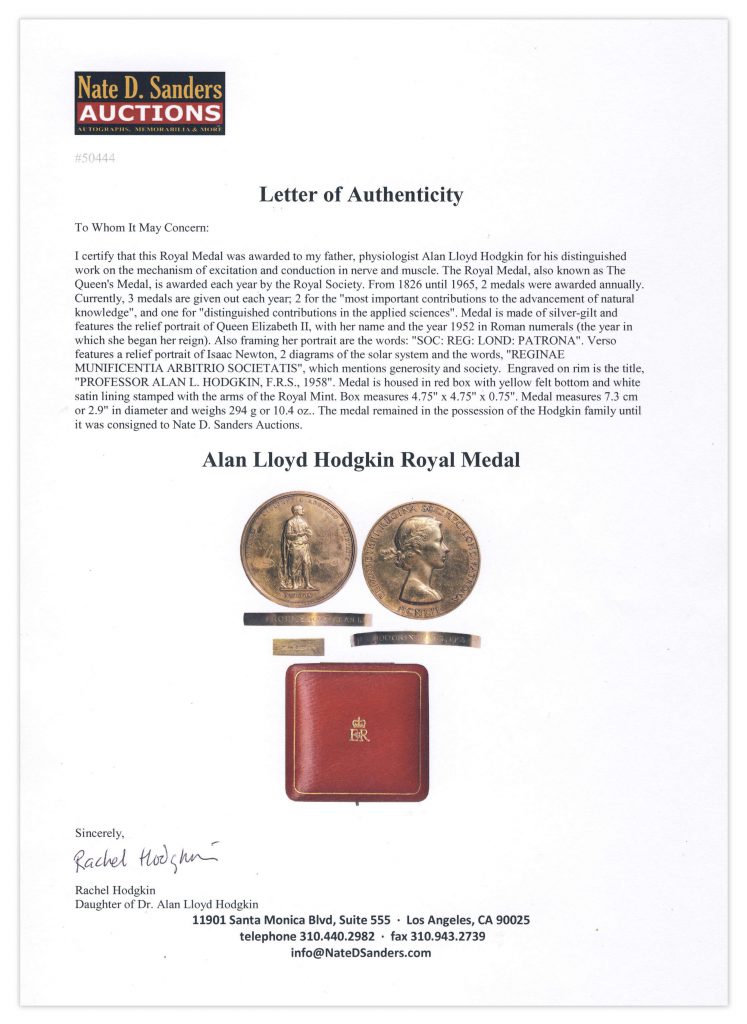 The 1958 Royal Medal awarded to physiologist Alan Lloyd Hodgkin for his distinguished work on the mechanism of excitation and conduction in nerves and muscle. The Royal Medal, also known as The Queen’s Medal, is awarded each year by the Royal Society. From 1826 until 1965, 2 medals were awarded annually. Currently, 3 medals are given out each year; 2 for the ”most important contributions to the advancement of natural knowledge”, and one for ”distinguished contributions in the applied sciences”. Medal is made of silver-gilt and features the relief portrait of Queen Elizabeth II, with her name and the year 1952 in Roman numerals (the year in which she began her reign). Also framing her portrait are the words: ”SOC: REG: LOND: PATRONA”. Verso features a relief portrait of Isaac Newton, 2 diagrams of the solar system and the words, ”REGINAE MUNIFICENTIA ARBITRIO SOCIETATIS”, which mentions generosity and society. Engraved on rim is the title, ”PROFESSOR ALAN L. HODGKIN, F.R.S., 1958”. Medal is housed in red box with yellow felt bottom and white satin lining stamped with the arms of the Royal Mint. Box measures 4.75” x 4.75” x 0.75”. Medal measures 7.3 cm or 2.9” in diameter and weighs 294 g or 10.4 oz. Spots of discoloration. Overall very good condition. With an LOA from the daughter of Dr. Alan Hodgkin. Sold for $43,750.