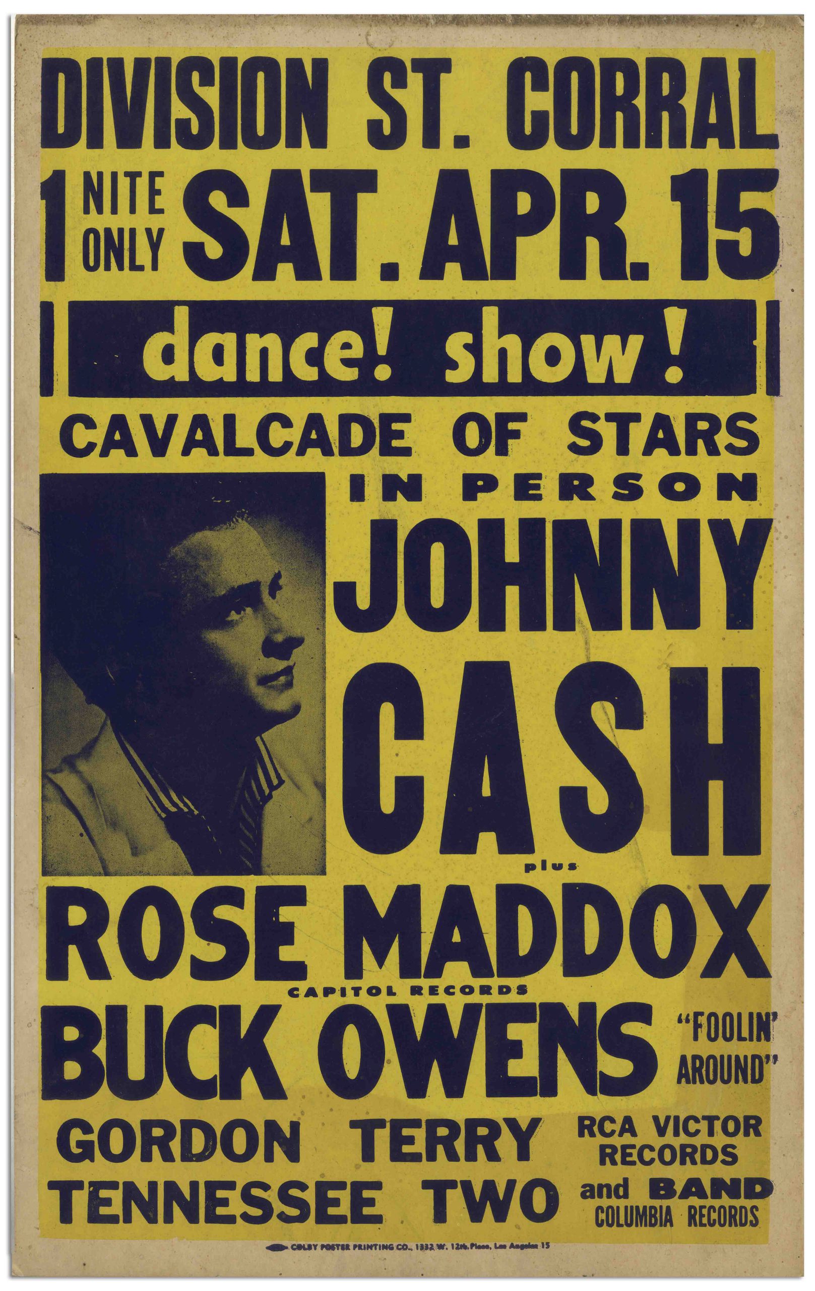 Johnny Cash concert poster for window display, promoting his show on Saturday, 15 April 1961 at the Division Street Corral in Portland, Oregon. Printed in navy blue against a yellow background, rare poster features an early publicity photo of Cash taken in 1955. Supporting acts include Rose Maddox, Buck Owens, Gordon Terry and the Tennessee Two. Printed on heavy card stock by Colby Poster Printing Co. in Los Angeles. Poster measures 14″ x 22″. Light wear, including foxing and some soiling, especially to top margin. Overall an attractive poster in very good condition. Sold for $2,200.