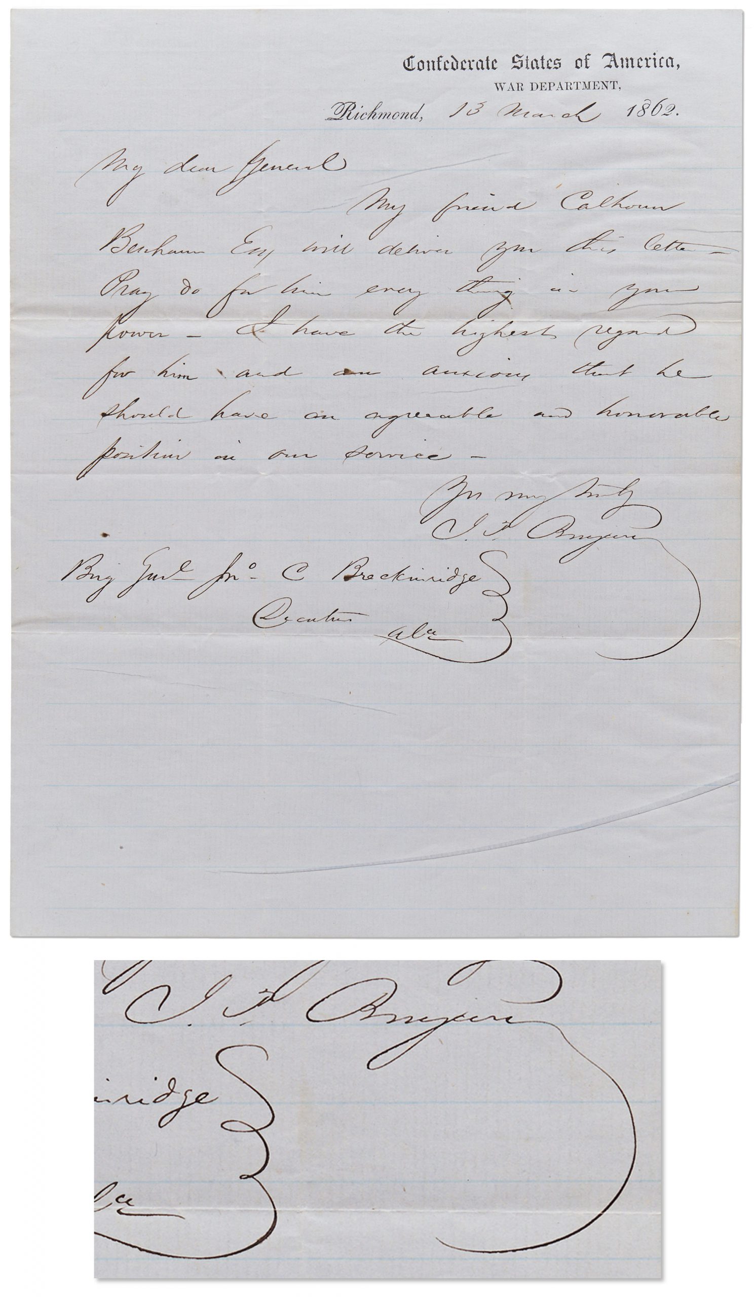 Judah P. Benjamin autograph letter signed, dated 13 March 1862 when Benjamin served as Secretary of War for the Confederate States of America during the Civil War. Benjamin also served as Attorney General and Secretary of State, the only Jew to serve in a cabinet level position for the CSA. Composed on Confederate States of America War Department letterhead, Benjamin recommends a friend to Brigadier General John C. Breckinridge, reading in part, “…Pray do for him every thing in your power – I have the highest regard for him and am anxious that he should have an agreeable and honorable position in our service…J. P. Benjamin”. Single page on lined pale blue bifolium stationery measures 7.75″ x 9.875″. With docketing on verso. Small split starting along one of the folds, overall very good plus condition. With 5″ x 7″ engraving of Benjamin. Sold for $1,520.