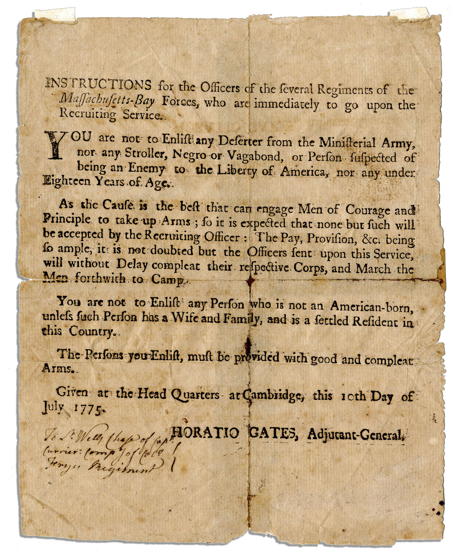 Broadside announces the recruitment of soldiers for the American Revolutionary War. The document, dated 1775 and signed in type by Horatio Gates as Adjutant General reads in full: ”Instructions for the Officers of the several Regiments of the Massachusetts Bay Forces, who are immediately to go upon the Recruiting Services. You are not to Enlist any Deserter from the Ministerial Army, nor any Stroller, Negro or Vagabond, or Person suspected of being an enemy to the Liberty of America, nor any under Eighteen Years of Age. As the cause is the best that can engage Men of Courage and Principle to take up Arms; so it is expected that non but such will be accepted by the Recruiting Officer: The Pay, Provision, etc. being so ample, it is not doubted but the Officers sent upon this Service will without Delay compleat their respective Corps, and March the Men forthwith to Camp. You are not to enlist any Person who is not American-born, unless such Person has a wife and Family, and is a settled Resident in this Country. The Persons you Enlist must be provided with good and compleat Arms. Given at the Head Quarters at Cambridge, this 10th Day of July, 1775. / Horatio Gates, Adjutant General”. Single-page broadside measures 6.5” x 8.25”. Toning, chipping and minor tears along edges, with separation to fold intersection from the left edge. Very good condition. Sold for $2,886.