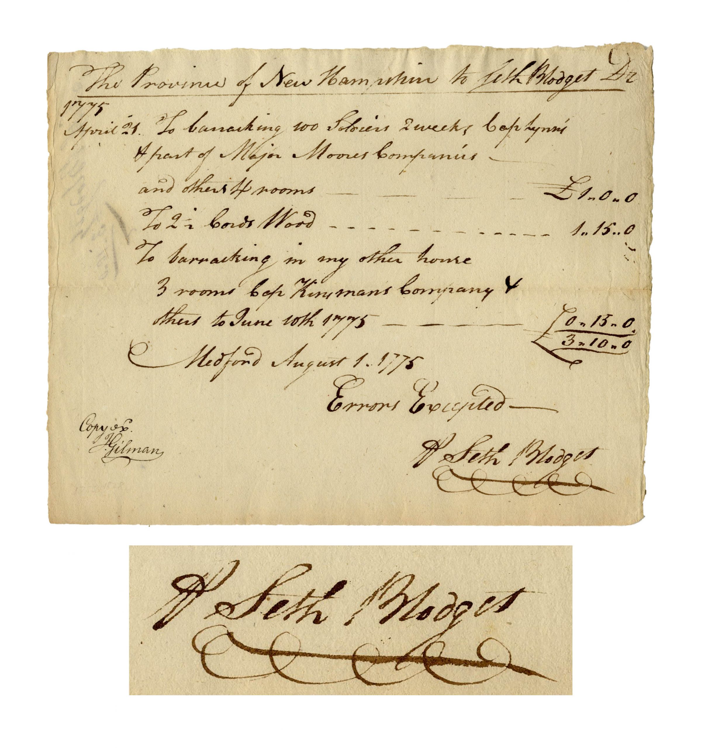 Revolutionary War document regarding the Battle of Bunker Hill, one of the first battles in the Revolutionary War during the Siege of Boston. Datelined 1 August 1775 from Medford, Massachusetts, document serves as a reimbursement receipt to Seth Blodget of Medford, who quartered soldiers who fought at Bunker Hill. Reads in part: “barracking 100 Soldiers [for] 2 weeks” beginning 21 April 1775 (two days after Lexington & Concord) for “Cap Lynn’s & part of Major Moore’s Companies”, as well as “3 rooms Cap Kinsman’s Company & others to June 10th 1775″. On 17 June 1775, the 1st New Hampshire Regiment companies of Captains John Moore and Aaron Kinsman — referenced in this document, fought at Bunker Hill, one week after Kingsman’s company left the residence of Seth Blodget. In fact, in this document dated approximately two weeks after Bunker Hill, Moore is referenced as Major, a promotion he received on 18 June to replace Major McClary who was killed during the Battle. Although the British were able to capture the Charlestown Peninsula as a result of Bunker Hill, it was a pyrrhic victory, as they lost 1,000 men in killed and wounded, including almost 100 officers. After Bunker Hill, the British declined to attack again until they ultimately retreated to Nova Scotia in March 1776, thereby ending the Siege of Boston. Document is signed by J. Gilman, likely John T. Gilman of New Hampshire, who later served as the state’s Treasurer and Governor. Measures 8.25″ x 6.5”. In well-preserved, near fine condition given age. Sold for $1,006.