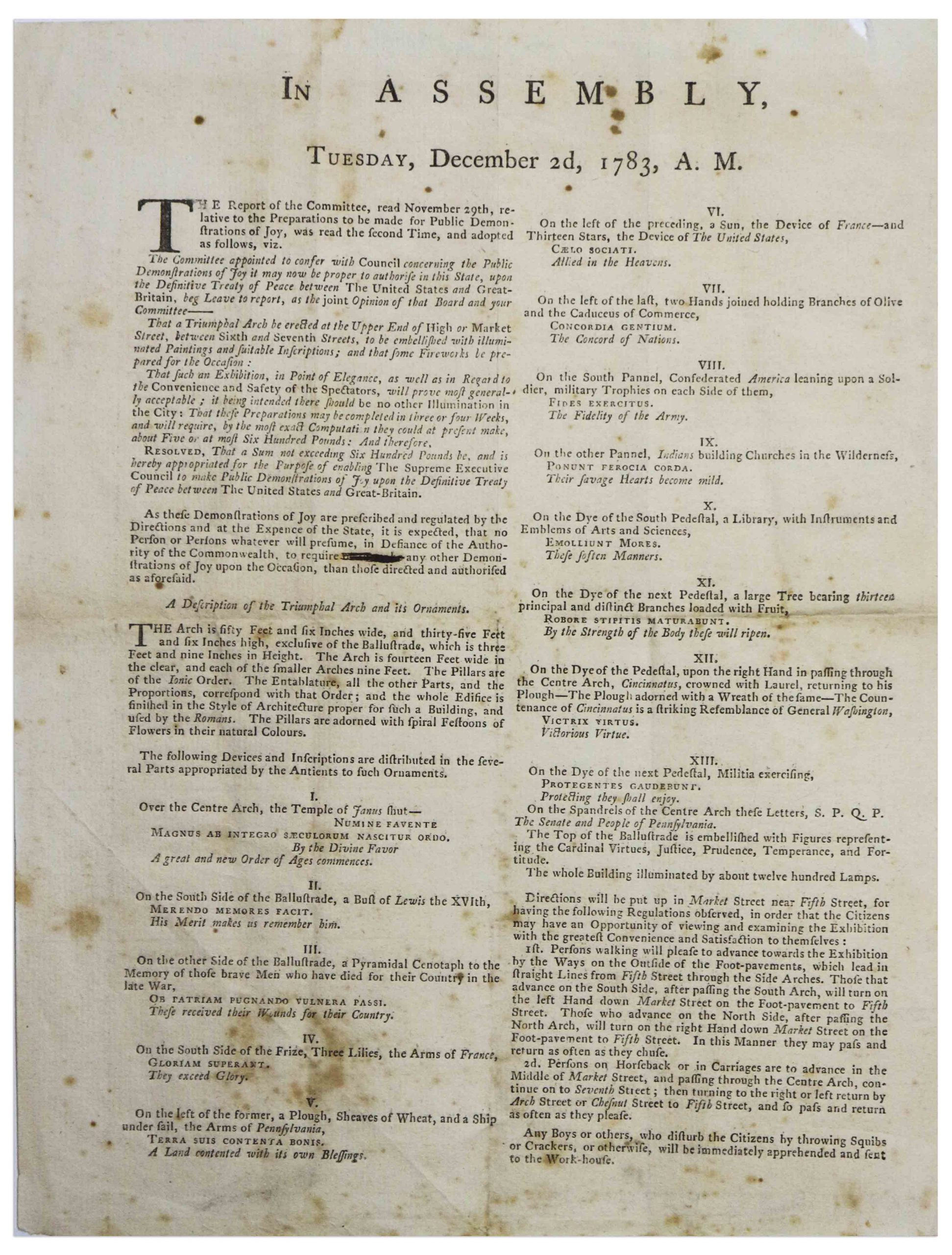 Revolutionary War Broadside Regarding “Demonstrations of Joy” to Mark the War’s End — With Details on the Infamous “Triumphal Arch” in Philadelphia, Which Erupted in Flames the Night of Its Debut