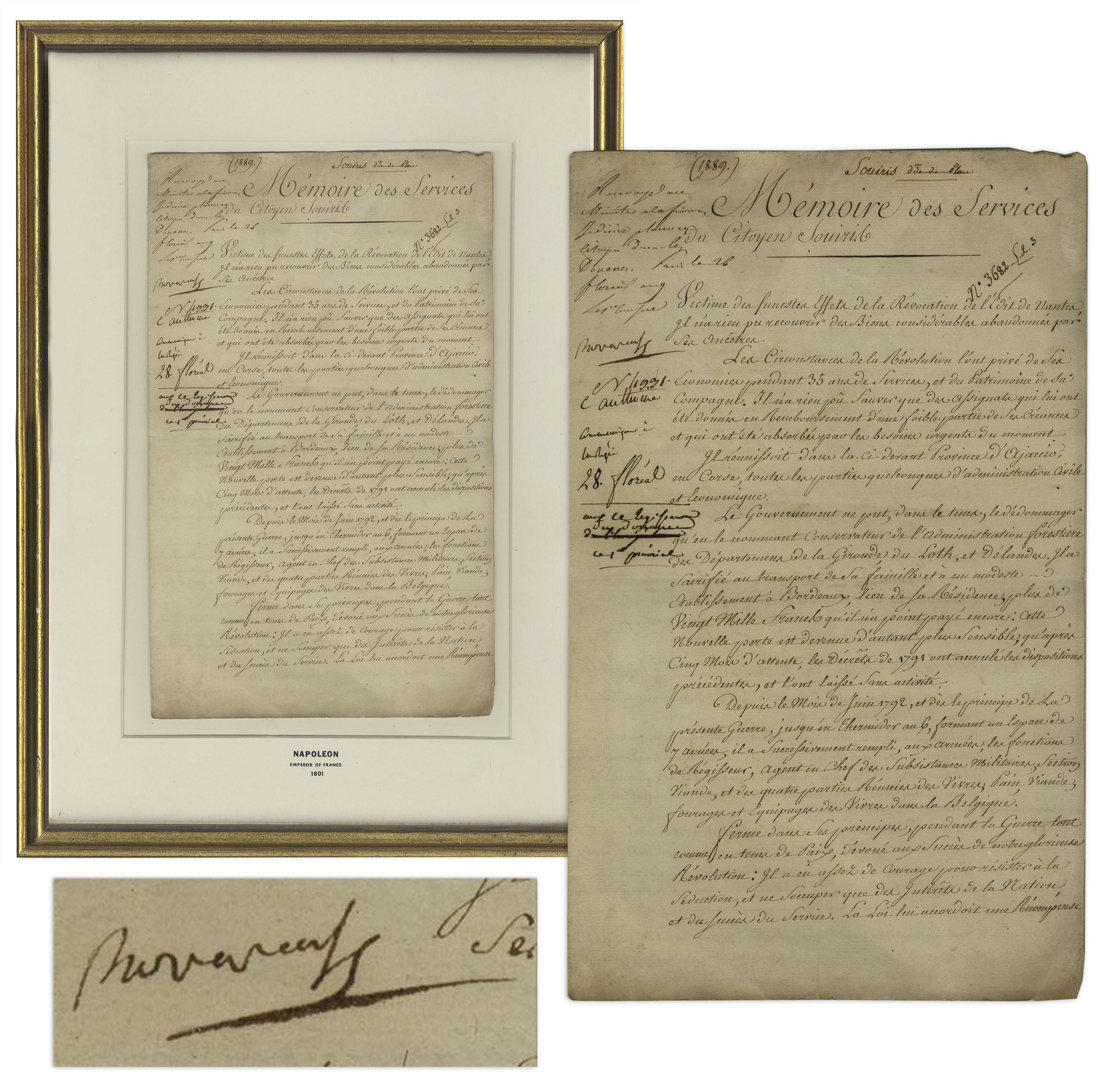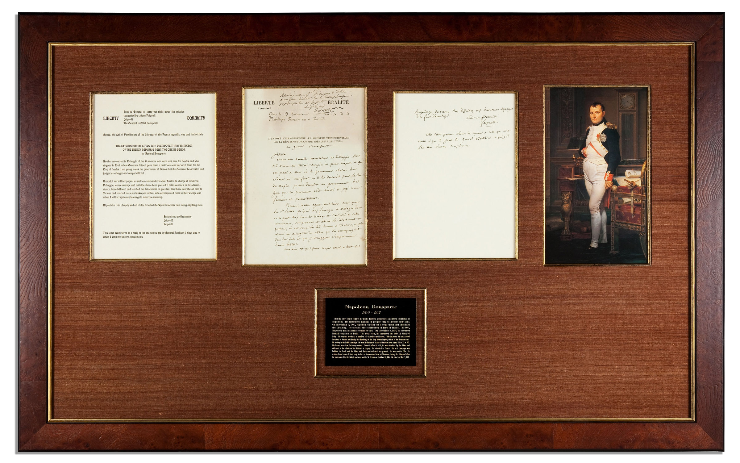 Napoleon Bonaparte autograph note signed as general-in-chief of the French Army in Italy during the First Italian Campaign in the French Revolutionary Wars. Bonaparte here orders the arrest of a Genoa governor. Written in French, it translates: ”Send to General to carry out right away the mission suggested by citizen [Minister] Faipoult. / The general in chief / Bonaparte”. He writes the order upon a letter sent to him by Guillaume Charles Faipoult de Maisoncelle, French minister to Genoa. Also written in French, it’s datelined Genoa, 17th of Vendemiaire [October] in the 5th year of the French Republic [1796]. The minister reports: ”…Another new arrest of the 46 recruits who were sent here for Naples and who stopped in Novi, where Governor Oliveri gave them a certificate and declared them for the King of Naples…” Napoleon’s signed note appears on the upper margin of the first page of the minister’s 2pp. letter on 2 sheets. Measures 8.5” x 12”. Near fine. Matted in a gilt wooden frame to an overall size of 46.25” x 28.75”. Document is flanked by a printed translation and a print of Jacques-Louis David’s 1812 portrait called ”The Emperor Napoleon in His Study at the Tuileries.” Sliver of chipping to frame left and bottom edges, else near fine. Sold for $2,291.