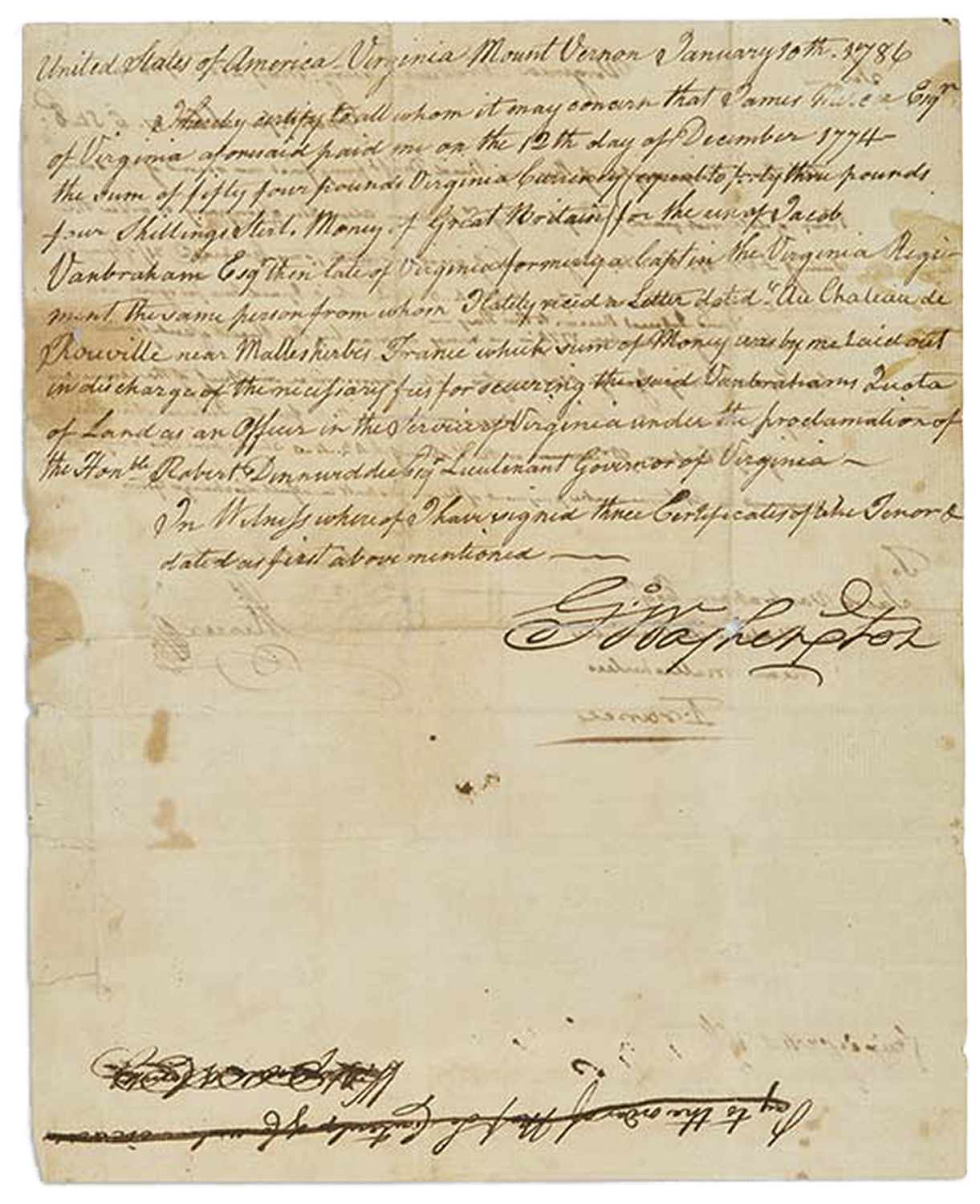 Fantastic George Washington document signed as ”late Commander in Chief of the American Army” regarding his disgraced mentor, Jacob Vanbraham, a mercenary soldier who instructed Washington in the use of military weapons and then served under Washington in the French and Indian War before fighting against Washington and for the British during the Revolutionary War. In this document Washington acknowledges a payment he received from James Mercer to offset costs that Washington incurred lending money to Vanbraham; this money was used by Vanbraham to secure his claim to back pay and land due to him for fighting in the French and Indian War. The land was previously denied because Vanbraham notoriously mis-translated the word ”assassination” in describing the death of French officer Joseph Coulon de Villiers de Jumonville by Washington’s men at the Battle of Fort Necessity, which ignited the French and Indian War. Document is datelined Mount Vernon, 10 January 1786 and boldly signed Go. Washington, acknowledging the payment from Mercer to Washington of ”currency for the use of Jacob Vanbraham Esq late of Virginia formerly a Capt in the Virginia Regiment…for securing the said Vanbraham’s quota of lands…under the proclamation of the Honble. Robert Dinwiddie…” Verso of document contains letter by James Mercer to Vanbraham, dated 21 May 1786 requesting that Vanbraham repay him the amount owed plus interest. Document measures 7.25” x 8.75”, framed in dark green suede with a descriptive plaque and engraving of Washington to a total size of 42” x 24”. Light spotting and folds, with some tissue repair to verso over Mercer’s signature; though Washington’s signature is bold, it’s written over a fold which has an unrepaired split bisecting the signature and a small hole at fold. Overall very good condition. Previously sold at California Book Auctions on 18 November 1998, lot 5747, and referenced in the ”Writings of George Washington”, Volume 28. Sold for $12,500.