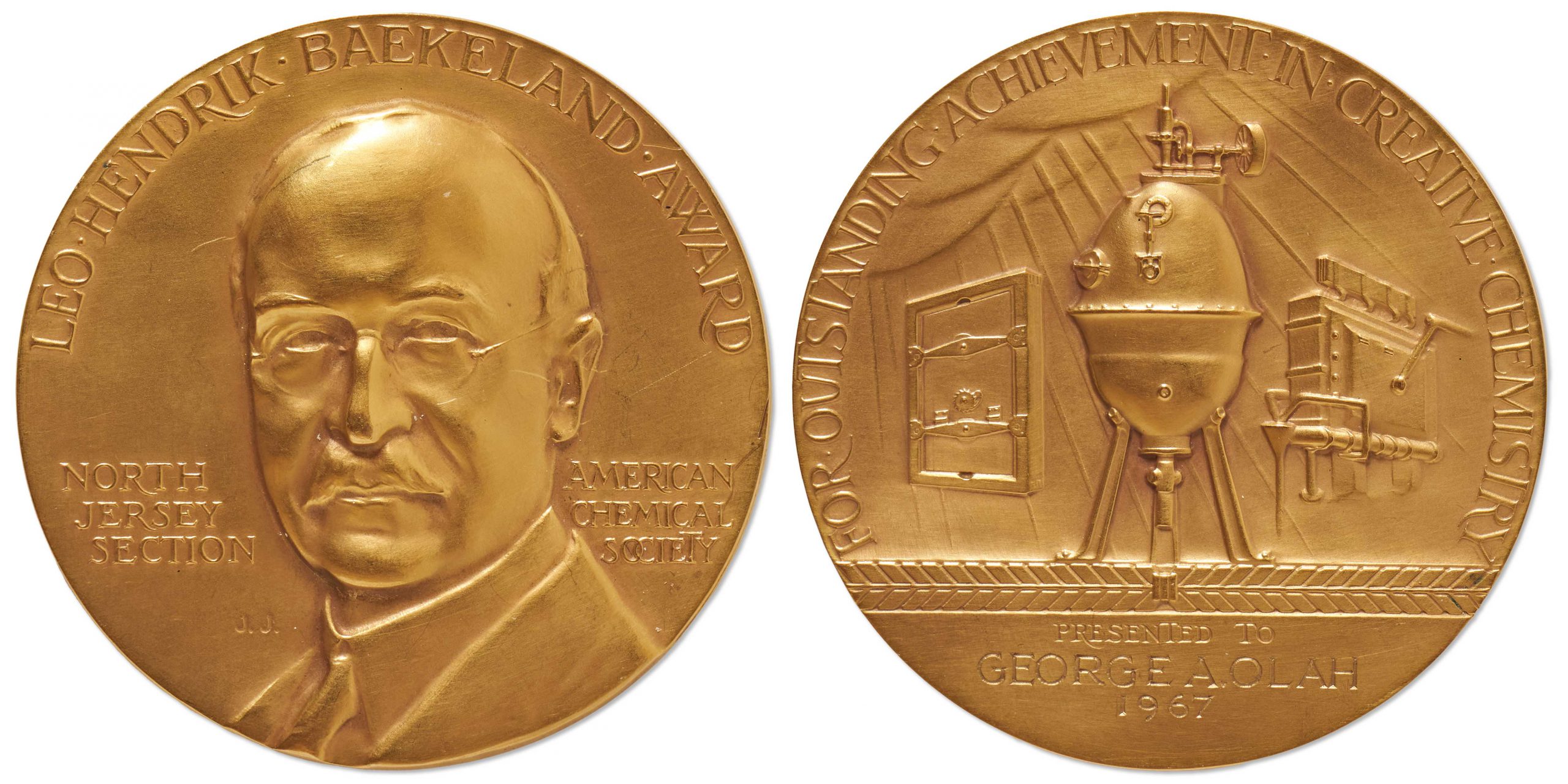 We at Nate D. Sanders Auctions sold a Leo Hendrik Baekeland medallion, along with other chemistry awards that were presented to George A. Olah. Please see below for details: