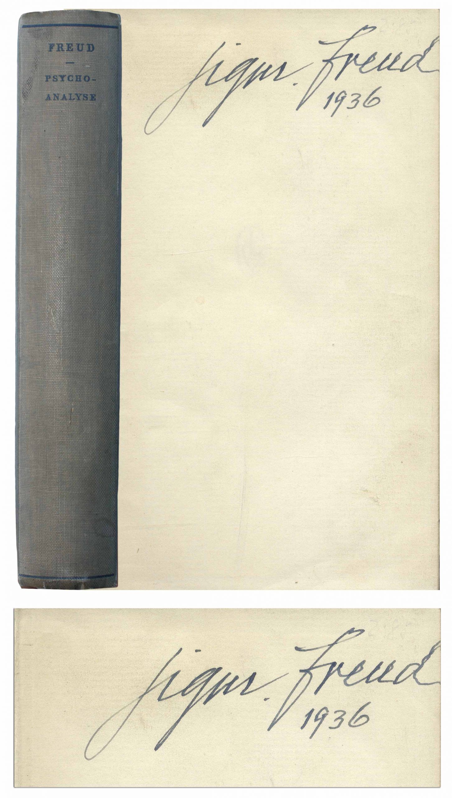 Sigmund Freud signed copy of his book, ”Lectures as an Introduction to Psychoanalysis”, the German language edition titled ”Vorlesungen zur Einfuhrung in die Psychoanalyse”. Berlin: Gustav Kiepenheuer Verlag, 1935. Signed by Freud on the front free endpaper in fountain pen, ”Sigm. freud / 1936”, a large signature measuring approximately 3.5” x 1.5”. Hardcover book bound in blue boards measures 4.5” x 7.5”. Some sunning to spine and slight cocking, overall in very good condition. Book originates from a town near Freiberg in Mahren, Freud’s birthplace. With University Archives COA. Sold for $6,655.