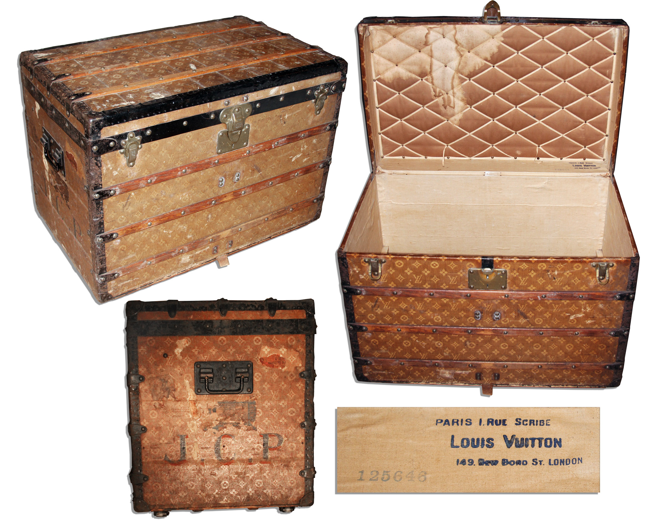 Vintage Louis Vuitton steamer trunk dating to the late 1920’s. Wooden trunk’s interior is stamped in blue ink, “Louis Vuitton / Paris 1. Rue Scribe / 149 New Noro St. London”. Also stamped with serial number 125646. Steamer trunk is wrapped in coated canvas bearing the signature “LV” monogram pattern and trimmed in black metal. Lid opens to a spacious interior lined in cream canvas, with lid lined luxuriously in caramel color fabric with faux tufting. Trunk on four casters features double handles and brass hardware including double buckle front closures and an LV stamped lock. Side is monogrammed in black ink, “J.C.P.” Measures 31.75″ x 19.75″ x 22.75″. Staining to upper left of lid lining and scattered nicks and scratches from use, else very good. Sold for $5,255.