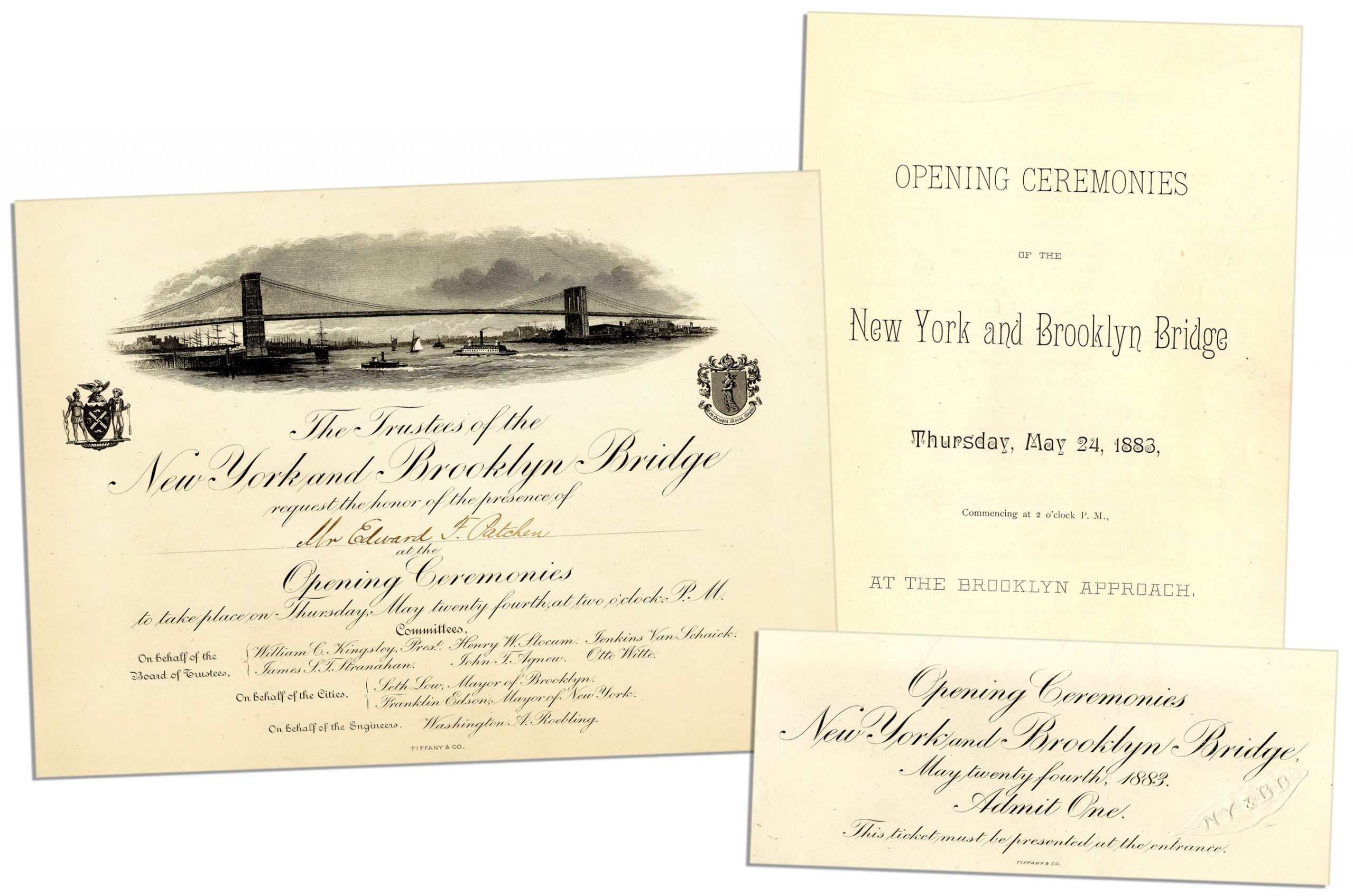 Rare set of Brooklyn Bridge opening ceremony documents, consisting of the invitation, ticket and program. Invitation to the 24 May 1883 celebration is addressed to New Yorker Edward F. Patchen. The focal point of the card is an etching of the suspension bridge stretching across the East River to connect Manhattan and Brooklyn. Its original name, the ”New York and Brooklyn Bridge” is printed in the largest font. Single-page invitation by Tiffany & Co. measures 9” x 6.5”. Admission ticket admits one and bears an embossed leaf design reading ”NY & BB” to the lower right. Also printed by Tiffany & Co., measuring 6.5” x 2.75”. The program lists the events of the ceremony, including an appearance by the President. The trustees, commissioners and engineers on the project are credited within. Runs 4pp., printed by Eagle Print, and measuring 5.75” x 8.5”. Lot includes Tiffany & Co. embossed envelope. Each piece is in near fine condition. Sold for $1,989.