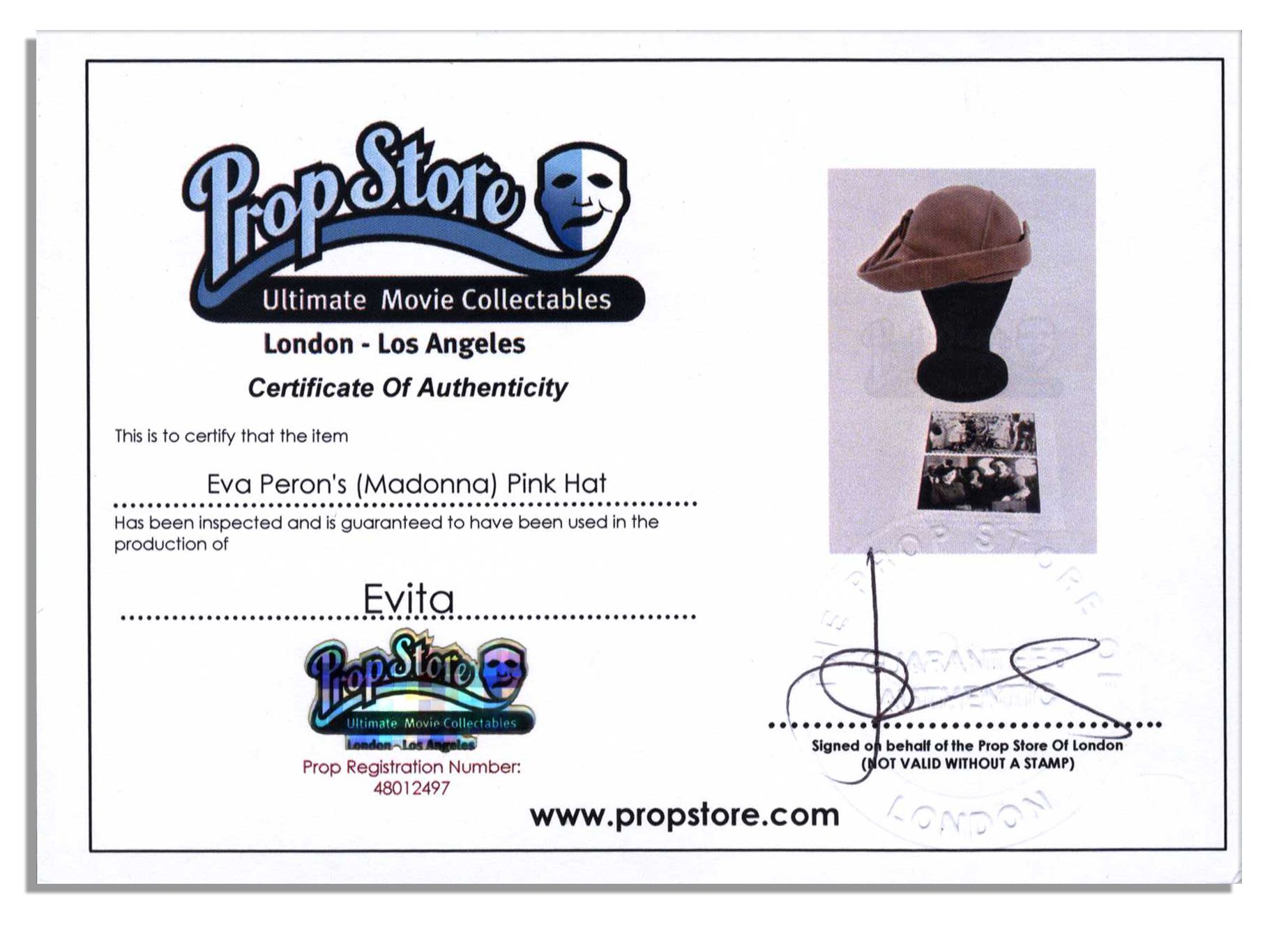 Light plum hat worn by Madonna in the 1996 musical drama ”Evita”. Madonna, together with costumer Penny Rose, broke Elizabeth Taylor’s Guinness World Record for most costume changes in a film, at 85 changes in this film. This is one of the 39 different hats used to crown Madonna in the picture. No label, brand or size is indicated. Hat is lined in black satin with the costumer’s tag pinned to it reading ”Sc 214”. Fine. With a COA from the Prop Store. Sold for $1,892.