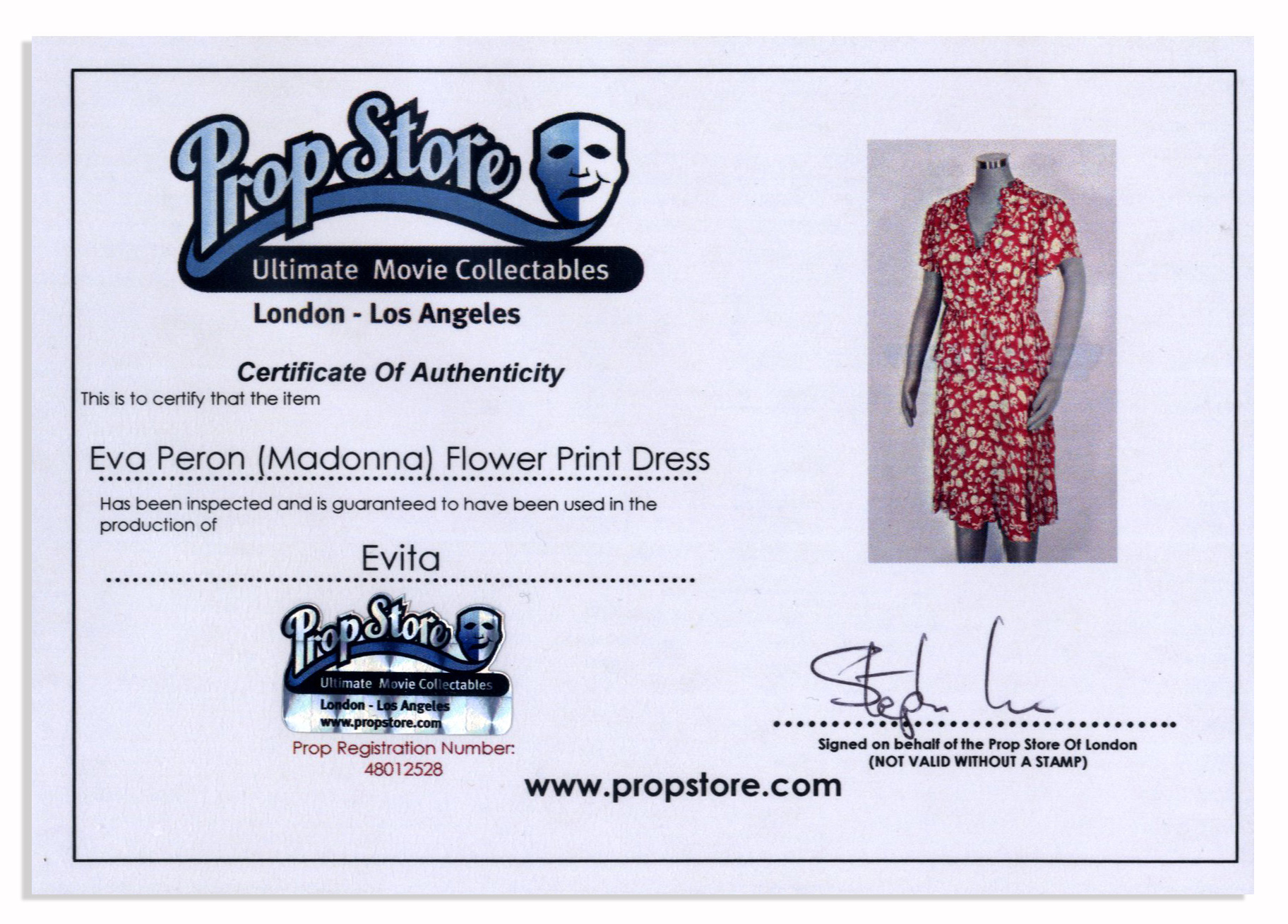 Dress made for Madonna in the 1996 musical drama ”Evita”. Madonna, together with costumer Penny Rose, broke Elizabeth Taylor’s Guinness World Record for most costume changes in a film, at 85 changes in this picture. Pink dress with cream floral and bow print was custom sewn for the star and is an approximate size M. Near Fine. With a wardrobe department tag and COA from the Prop Store. Sold for $1,720.