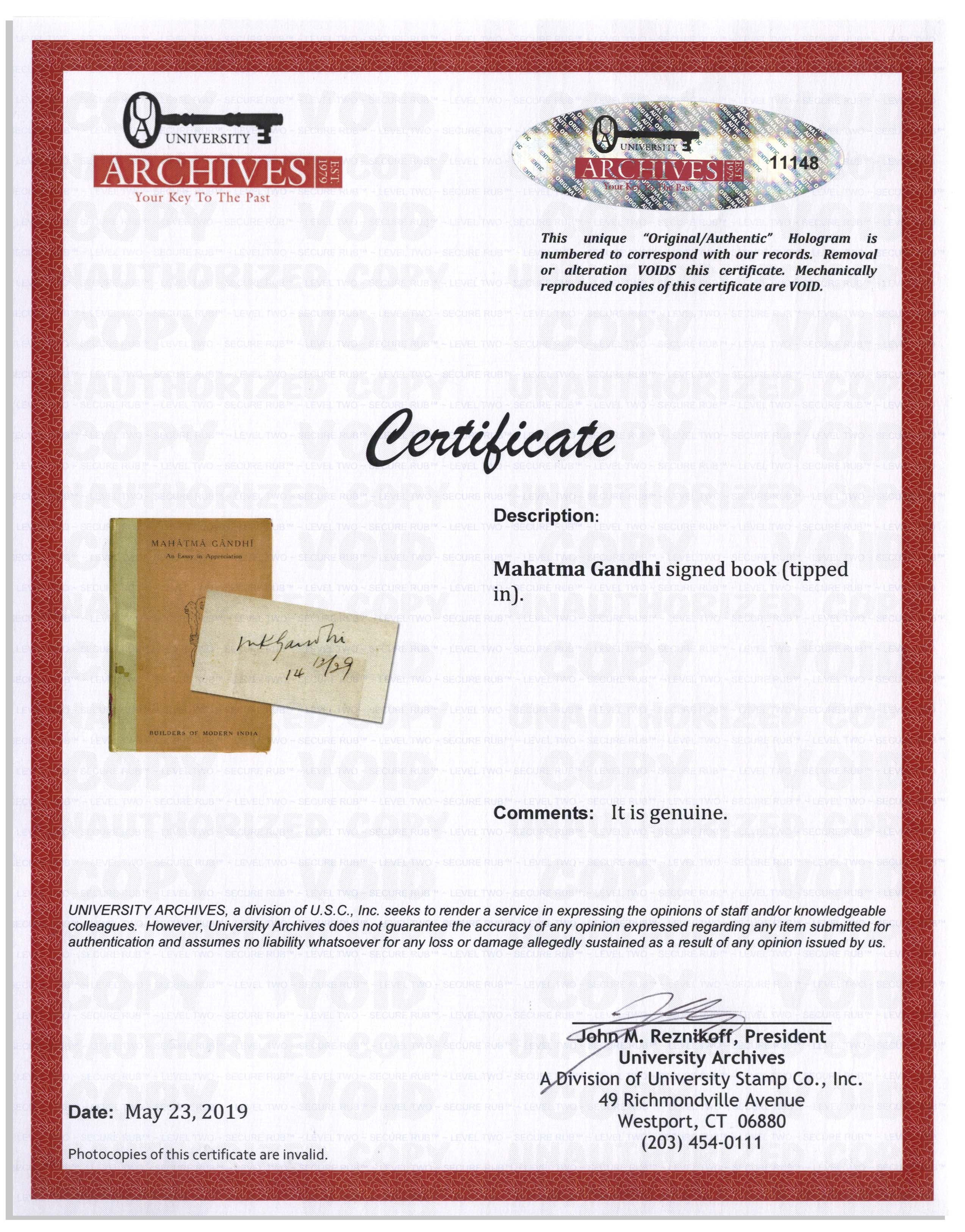 Mahatma Gandhi signature within a book dedicated to his life and philosophy of non-violence, ”Mahatma Gandhi An Essay in Appreciation”. Gandhi signs upon the tipped-in front free endpaper, ”MK Gandhi” with what appears to be the date underneath of 14 December 1929. Published in Calcutta: Association Press, 1924. Hardback volume runs 136pp., with a color frontis portrait of Gandhi. Measures 5” x 7.5”. Some light staining and wear to boards, a few pages separated from front joint, and the private library label of Katherine Osborne who writes above it, ”Read crossing from Calcutta to Rangoon…1926”. Overall very good condition. With University Archives COA. Sold for $3,781.