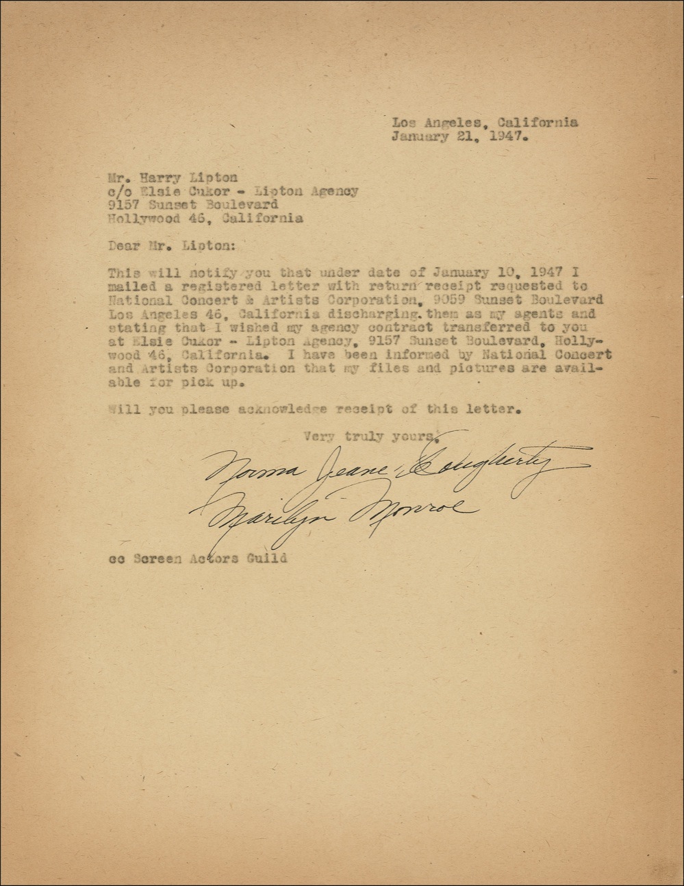 Marilyn Monroe changed her name from Norma Jeane at the start of her film career in 1946. “Marilyn” was reportedly selected after Broadway star Marilyn Miller and “Monroe” was her mother’s maiden surname. We sold a Marilyn Monroe contract amendment with 20th Century Fox signed as both “Norma Jeane Dougherty” and “Marilyn Monroe” for $20,939. The typed document measures 8.5 x 11 inches and is dated 10 February 1947, shortly after her name change.