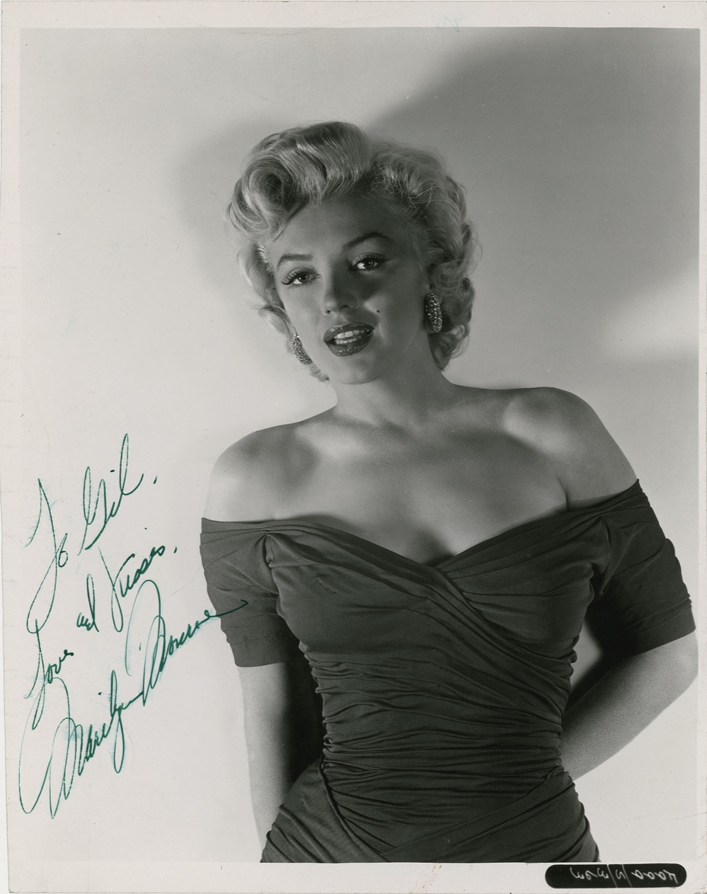 We realized $12,017 for a Marilyn Monroe signed photograph taken by 20th Century-Fox photographer Frank Powolny. The photo dates back to the early 1950s when Powolny was photographing Monroe for a Gentleman Prefer Blondes campaign designed to make her the studio’s new sex symbol and Betty Grable’s replacement. Glossy 8 x 10 inch photo is inscribed, “To Gil, Love and Kisses, Marilyn Monroe”.