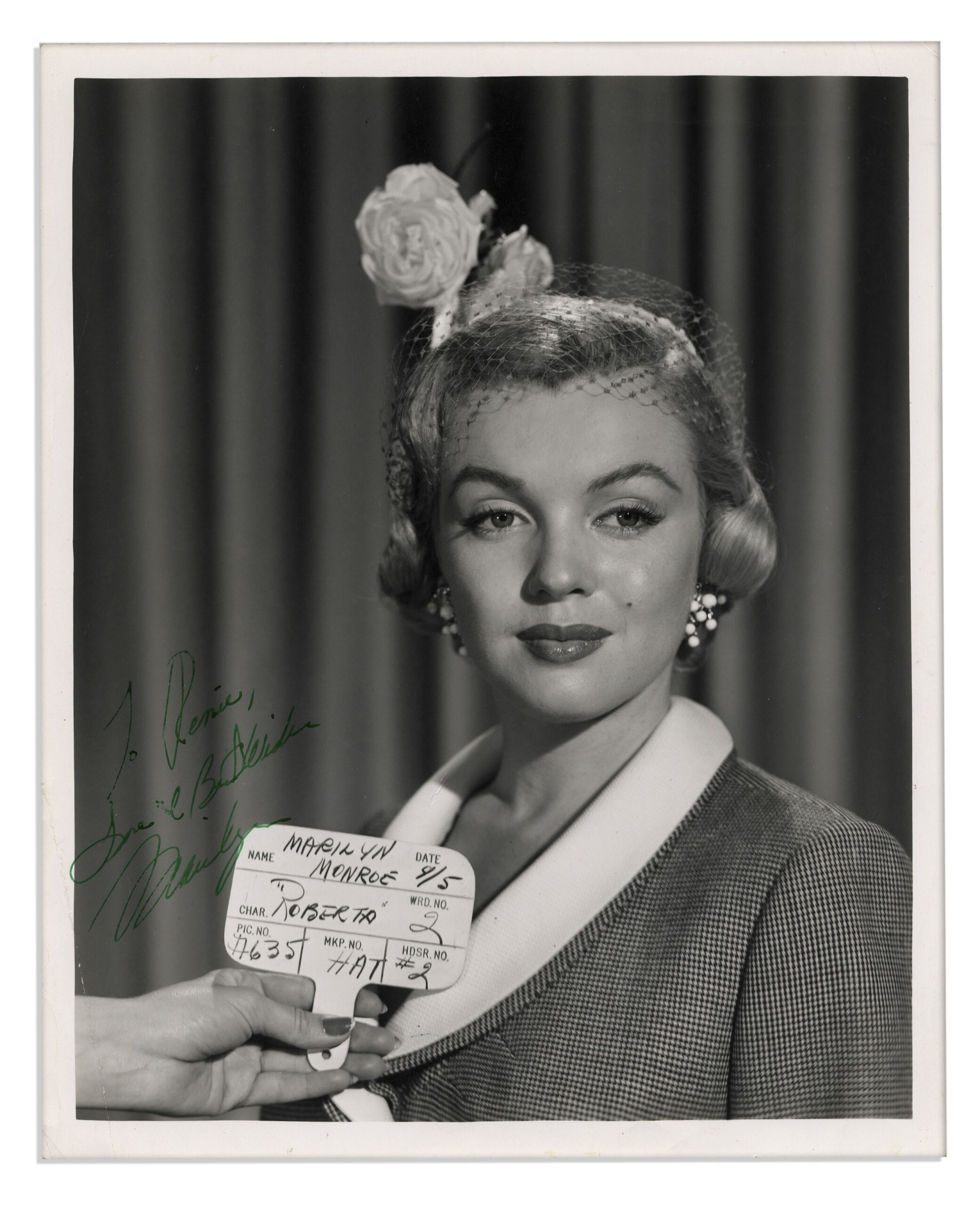 The 1951 film Love Nest is a romantic comedy that Marilyn Monroe has a supporting role in shortly before her Hollywood career took off. We realized $9,589 for a Marilyn Monroe signed costume test photo taken for her role as “Roberta”. Photo measures 8 x 10 inches and is inscribed to costume designer Renie Conley, “To Renie, Love & best wishes, Marilyn” in green ink.