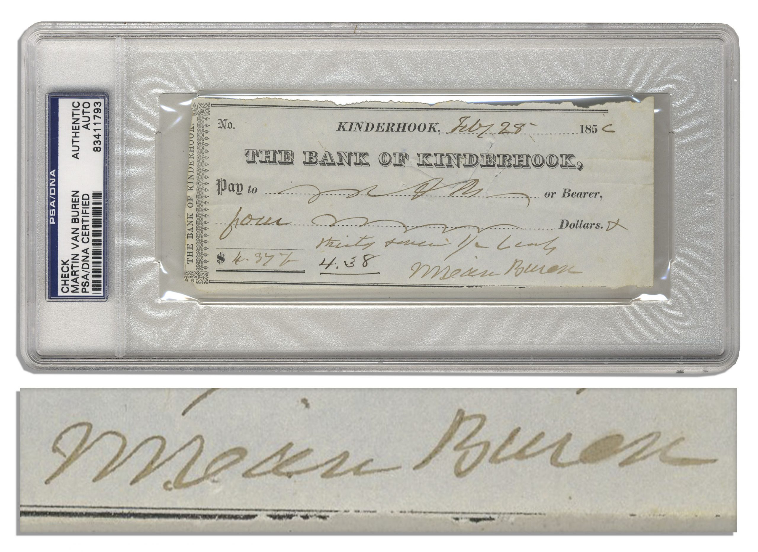 Martin Van Buren check signed, ”Martin Buren”. Bank of Kinderhook check is dated 28 February 1856 and made out to an illegible recipient in the amount of $4. Measures 6.25” x 2.5”. Irregularly trimmed edges, thinning to paper and closed tears. Very good overall. Encapsulated by PSA/DNA with COA. Sold for $750.
