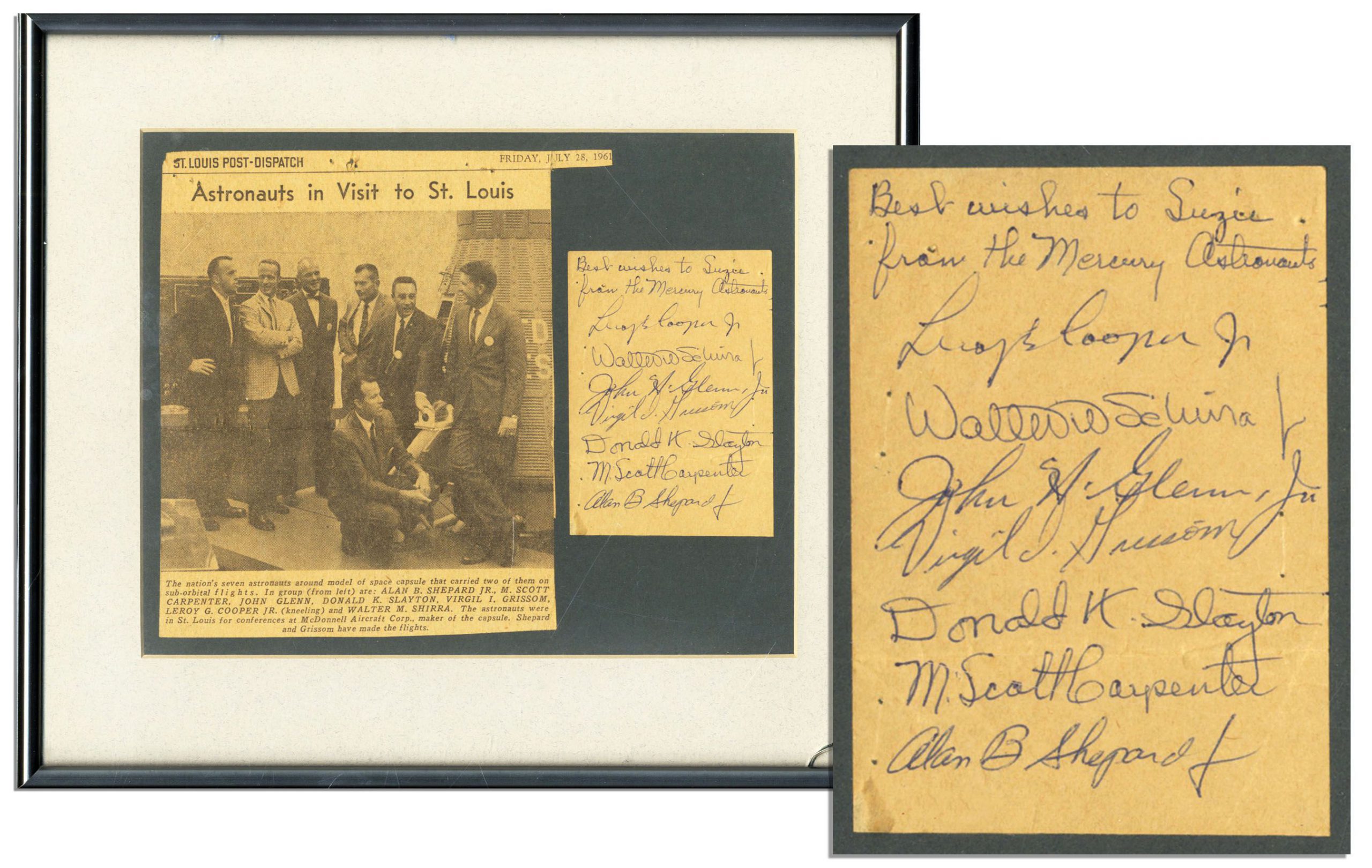 All of the original Mercury 7 astronauts here sign a slip in blue ink. The slip is inscribed by an unknown hand: ”Best wishes to Suzie / from the Mercury Astronauts”. Beneath, the autographs read: ”Leroy G. Cooper Jr / Walter M Schirra / John A Glenn, Jr / Virgil I. Grissom / Donald K. Slayton / M. Scott Carpenter / Alan B. Shepard Jr”. 2.75” x 3.75” slip comes mounted to a muted dark blue-green mat. Very good with uniform toning and light creasing. Beside the slip, an original newspaper photo from the 28 July 1961 issue of the St. Louis Post-Dispatch is also mounted. It shows the 7 space heroes posing beside model spacecraft on their visit to that city. Framed neatly in brushed steel to an overall size of 11.75” x 10.25”. Crack to non-glare glass at the lower right corner, else near fine. Sold for $2,772.