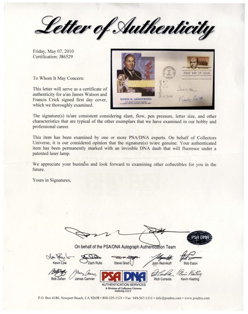 Nobel Prize winning scientists, James Watson and Francis Crick signed FDC, with a drawing of their discovery — the infamous double helix strand of DNA. Signed “James D. Watson” and “Francis Crick”, Watson also draws the double helix, marking it as “DNA” and identifying it as either a “D-T” or “G-C” strand. Postmarked Washington DC, 21 September 1983, first day cover honors Edwin H. Armstrong who invented the FM radio. Measures 6.5″ x 3.5″. Near fine condition. With PSA/DNA COA. Sold for $3,884.