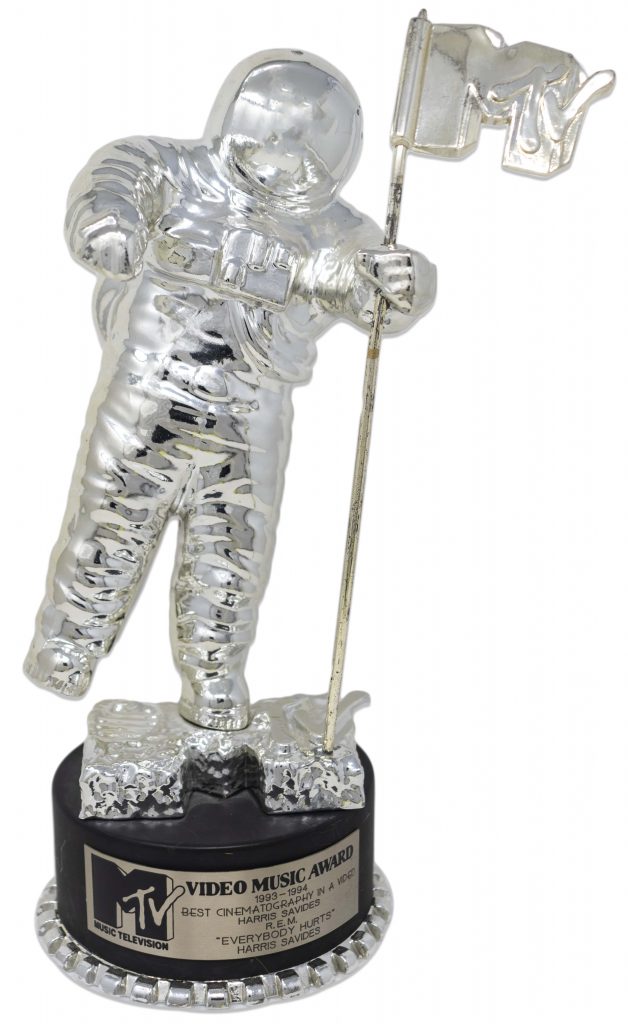 MTV ”Moonman” Video Music Award for Best Cinematography for R.E.M.’s 1993 music video ”Everybody Hurts”, the memorable Fellini inspired video. Moonman was won by famed cinematographer Harris Savides who is the only cinematographer to have won three MTV Moonman awards for Best Cinematography. Savides also worked with scores of film directors during his celebrated career, including Martin Scorsese, David Fincher, Gus Van Sant, Ridley Scott and Sofia Coppola. Silver trophy is a sculpture-in-the-round, patterned after the channel’s iconic bumper. Award measures 11.5” in total height. Base diameter measures 5”. Weighs approximately 6 pounds, 4 ounces. Light wear, overall very good to near fine condition. Sold for $5,500.