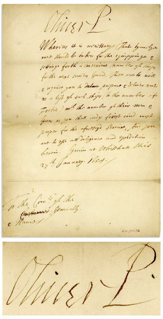 Oliver Cromwell letter signed “Oliver P” as Lord Protector of the Commonwealth, from Whitehall Palace on 27 January 1654 shortly after Cromwell’s appointment in December 1653. As Protector, Cromwell signed his documents as “Oliver P”, similar in style to the “R” following the signature of a monarch although ostensibly, the Protectorate was designed to pivot away from monarchy. In this letter, written to the Commissioners of the Admiralty and Marine, Cromwell readies the Summer Guard to defend British shipping from Barbary pirates. Sold for $3,983.